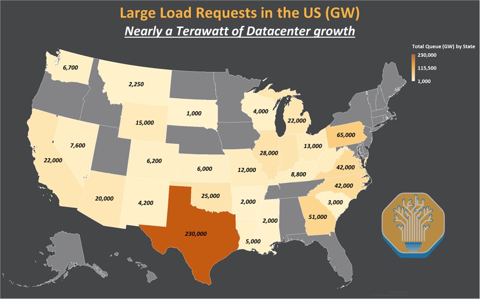 But we’ve hit a tipping point. The large datacenters coming online in 2024-25 secured their power in 2022-23, before the gold rush. Since then, the scramble has been relentless. We estimate roughly a terawatt of load requests have been submitted to US utilities and grid operators.