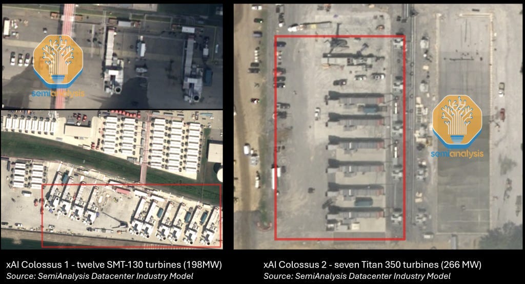 Eighteen months ago, Elon Musk shocked the datacenter industry by building a 100,000-GPU cluster in four months. Multiple innovations enabled this incredible achievement, but the energy strategy was the most impressive. xAI entirely bypassed the grid and generated power onsite, using truck-mounted gas turbines and engines. As shown below, xAI has already deployed over 500MW of turbines near its datacenters. In a world where AI Labs are racing to be first with a Gigawatt datacenter, speed is the moat.