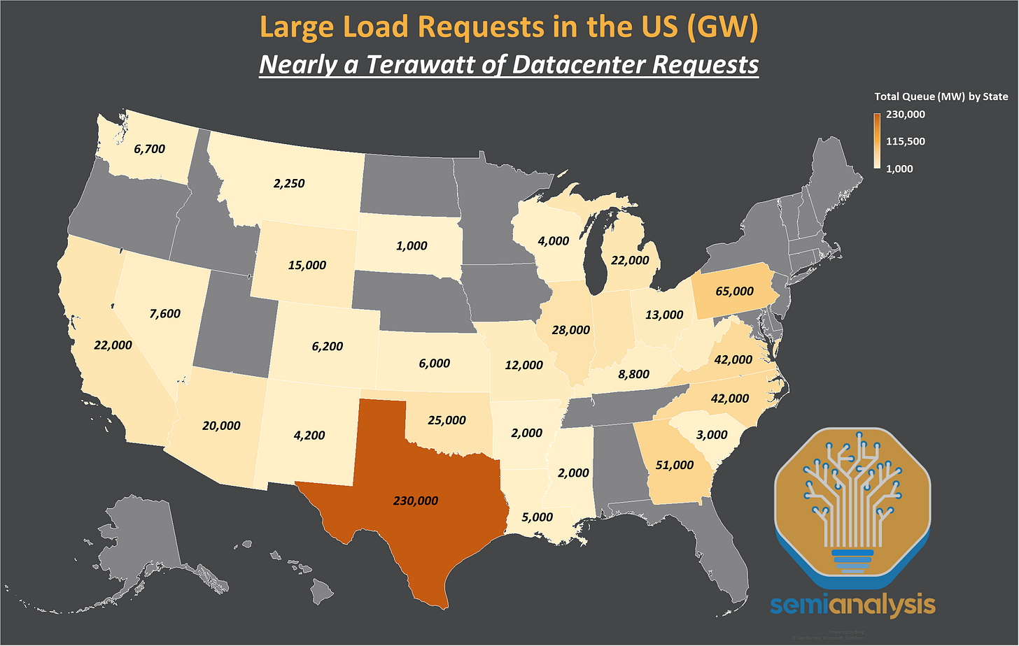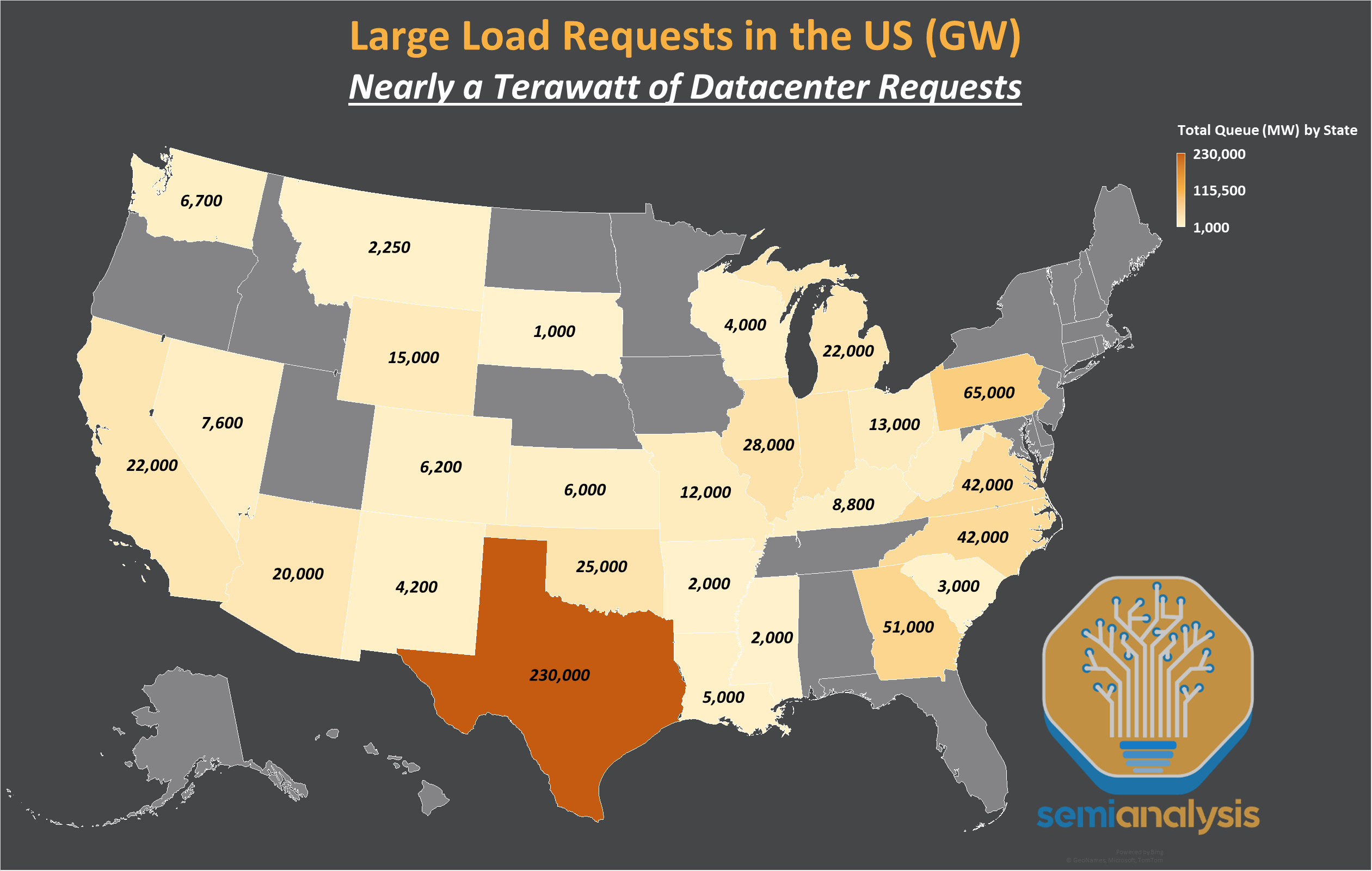But we’ve hit a tipping point. The large datacenters coming online in 2024-25 secured their power in 2022-23, before the gold rush. Since then, the scramble has been relentless. We estimate roughly a terawatt of load requests have been submitted to US utilities and grid operators.