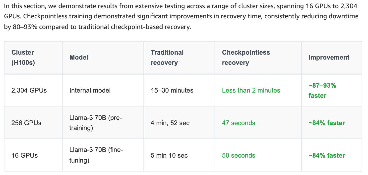 AWS introduced checkpointless training for their SageMaker Hyperpod EKS clusters in December 2025. This is a kubernetes-only, and NeMo megatron-only solution to the same fault tolerance problem described earlier. Amazon developed this technology internally for training their Nova models and has proven it at 1k+ GPU scale.