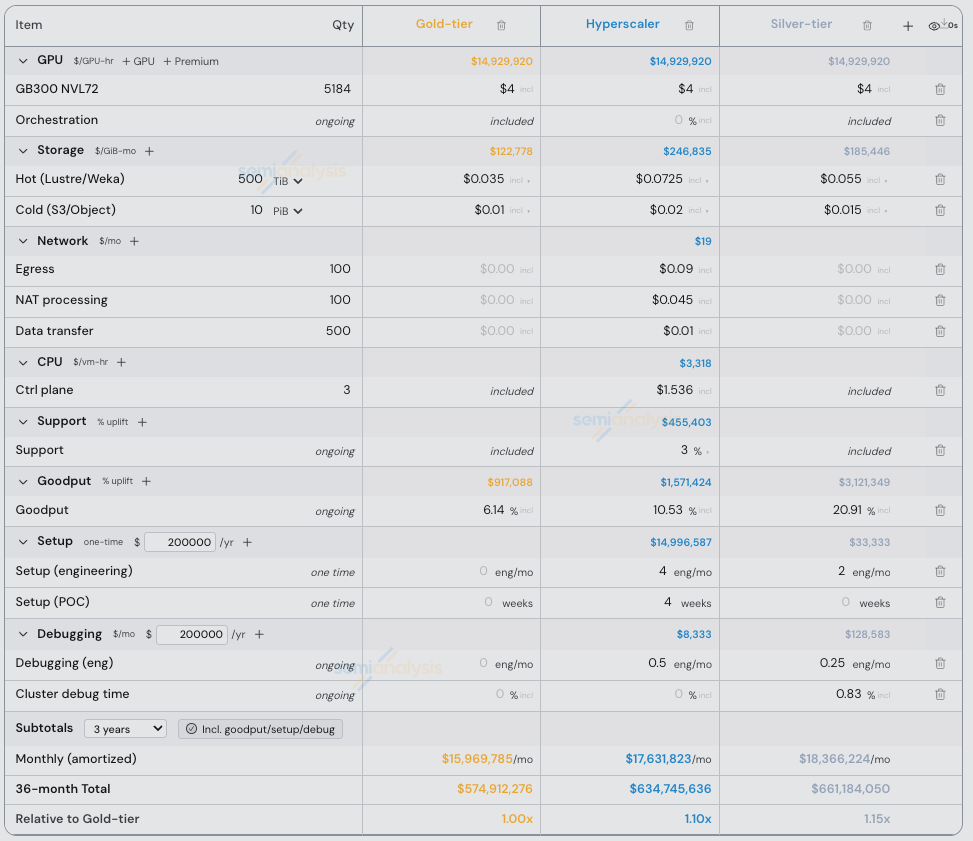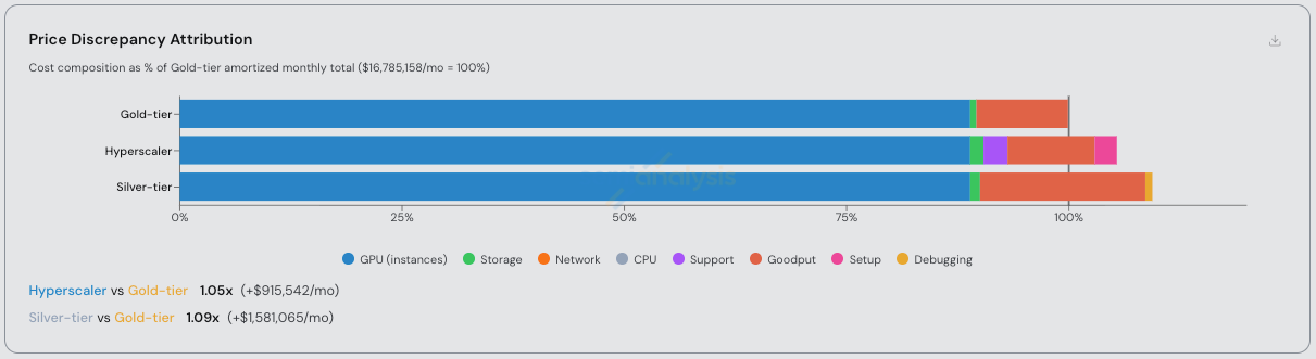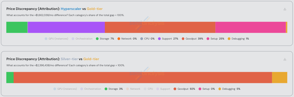 For the Silver-tier neocloud, the 15% price discrepancy is primarily attributed to the additional cost of goodput loss/downtime, setup (engineering time spent on health checks, performance tuning), and storage.