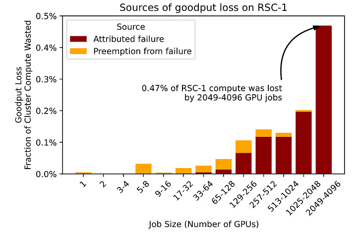 As we explained in ClusterMAX 2.0, cluster-level MTBF also plays a role here. Since all GPUs eventually fail, the bigger your job, the less time you have to do useful work (goodput) in between failures.