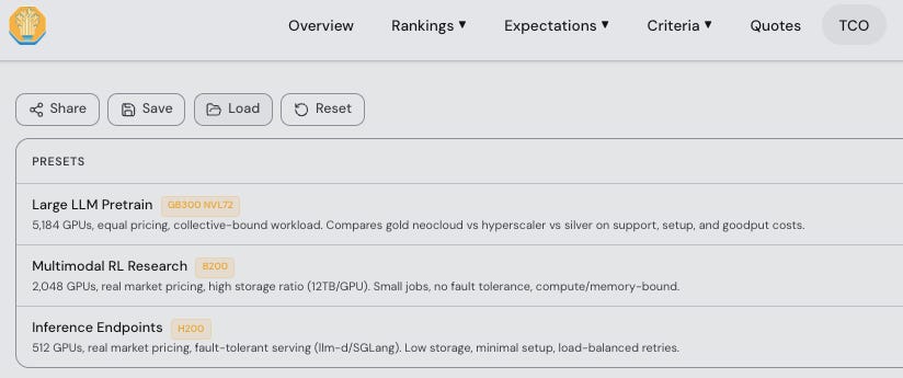 These calculators are supported by input data from our GPU Rental Pricing data series, hands-on experience testing 80+ neoclouds, and interviews with over 150 end-user customers of neoclouds which were conducted during the research effort for ClusterMAX 1.0, ClusterMAX 2.0, and continue to this day for ClusterMAX 3.0.