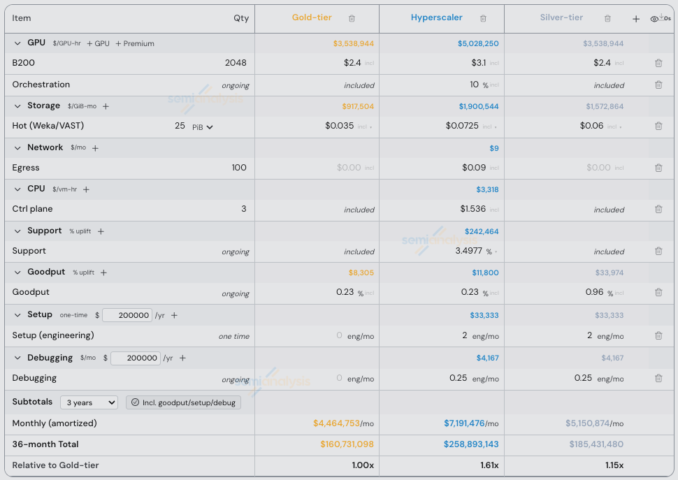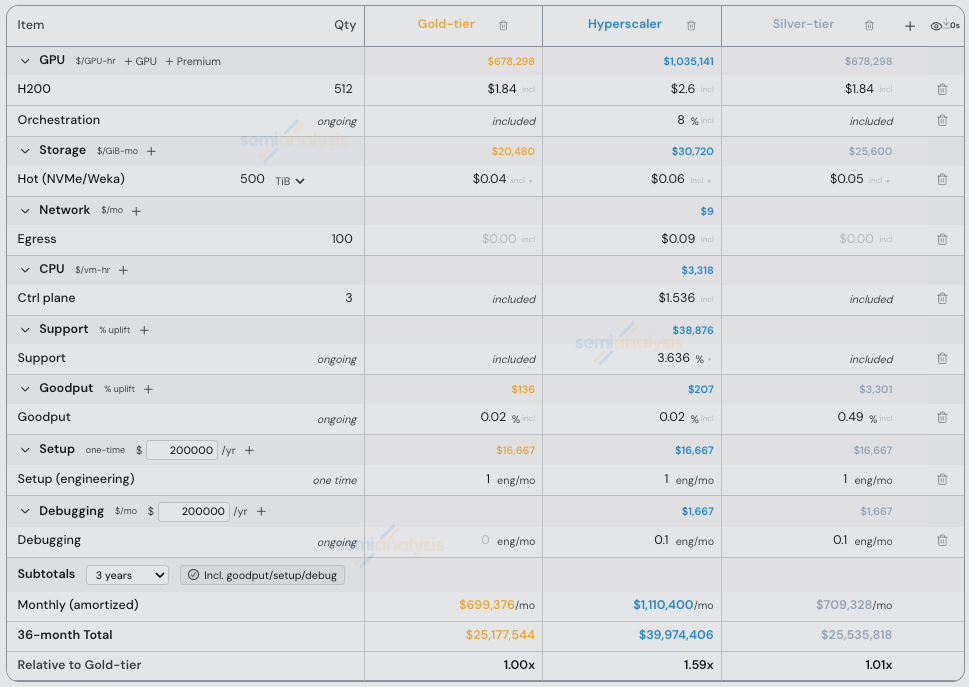 Overall, the discrepancy in price when comparing Gold-tier, Hyperscaler, and Silver-tier on a 3 year term is 1x, 1.61x, and 1.15x respectively for this scenario. For the Hyperscaler, this 61% price discrepancy is primarily attributed to the additional cost of the GPUs and orchestration software, storage, and setup time. For the Silver-tier neocloud, the 15% price discrepancy is primarily attributed to the additional cost of storage, with a small amount being goodput and debugging time.