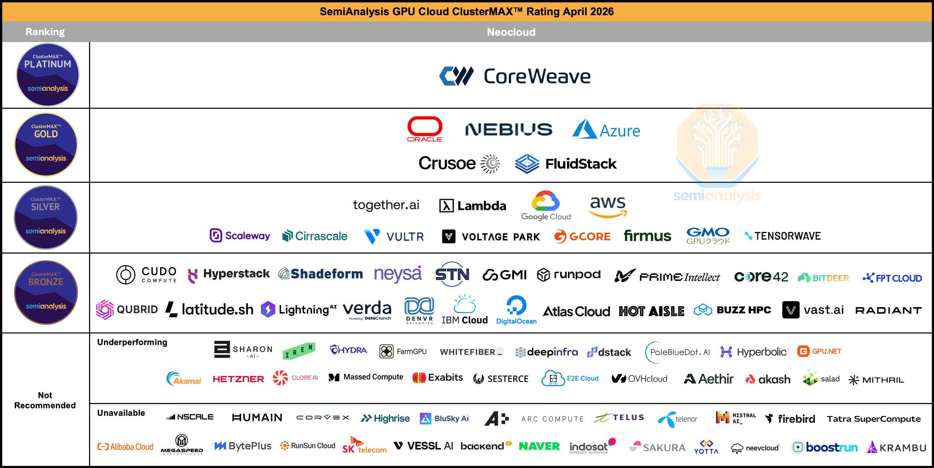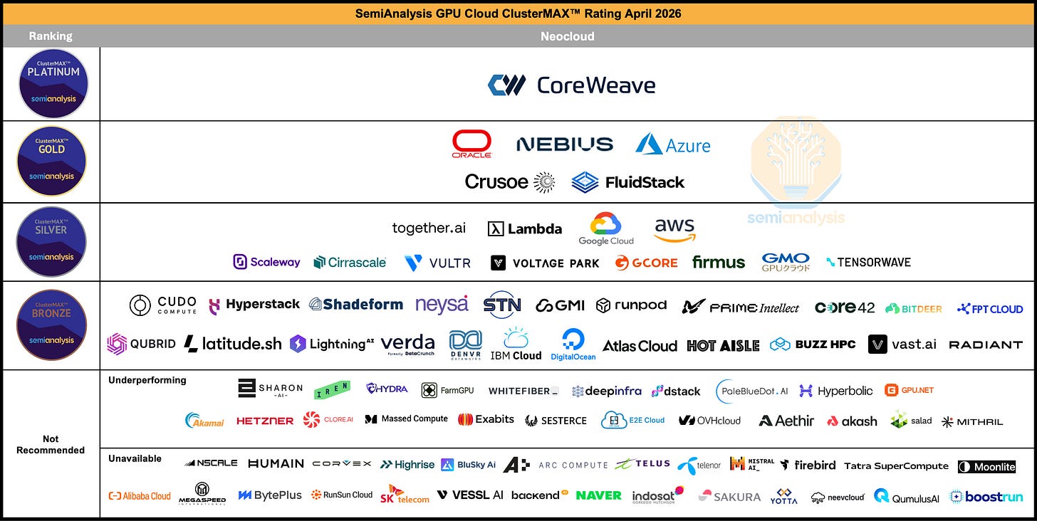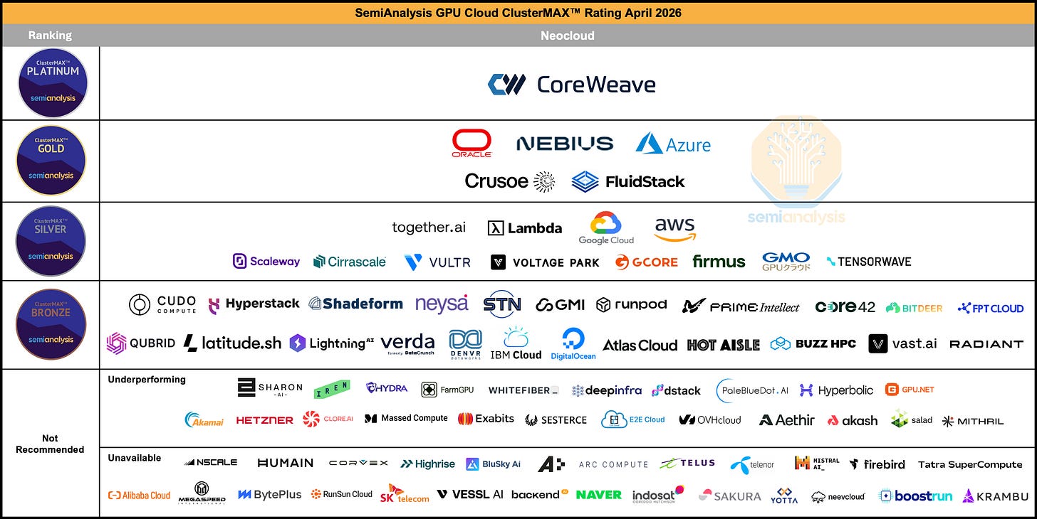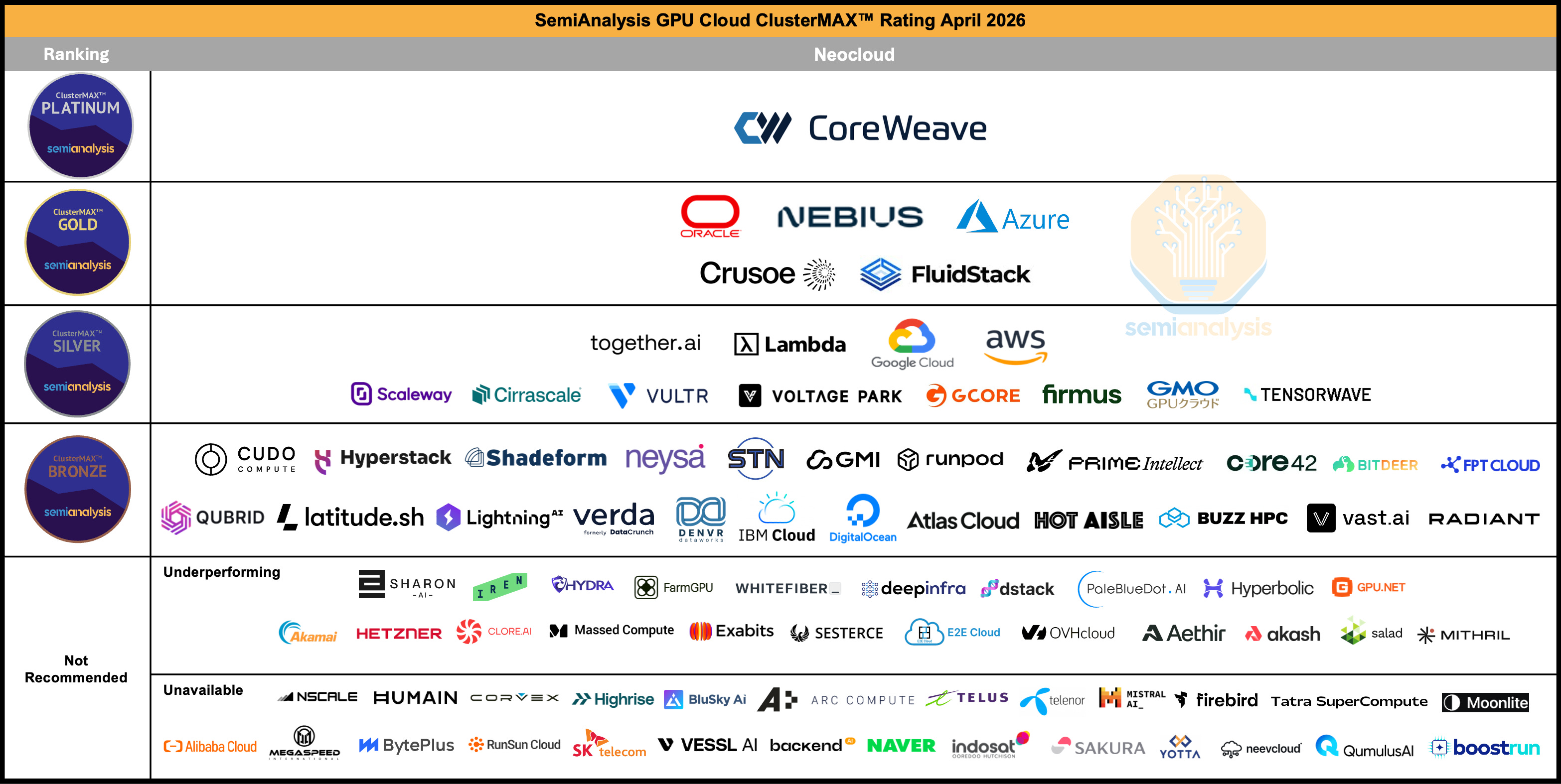 Source: SemiAnalysis ClusterMAX 2.1 Ratings (April 2026)
