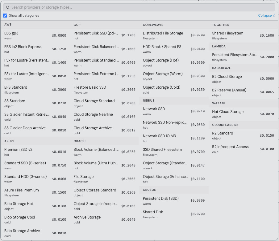 2. Storage [$/GB-mo]: The cost of storing data. This includes high-performance “hot” storage (e.g. NVMe-based parallel file systems), lower-tier “warm” or object storage for less frequently accessed data, and “cold” archival storage. We also include any data access costs: for instance, API call costs on object storage or data egress charges if data leaves the cloud. These can be substantial during training when moving around large datasets and model checkpoints, and during inference when considering storing logs and metrics (now including image, video, and audio data). Based on customer surveys, we adjust our assumptions across different cluster scenarios from a low point of 2TB/GPU to a high point of 25TB/GPU. We also track the public pricing (standardized to per GB, per month) across various providers and release this data for free as a dropdown menu in the Cluster TCO Calculator. Notably, storage performance can vary massively even between different offerings even from the same provider. For example, AWS FSx for Lustre has 4 different throughput tiers (ranging from 125 MB/s/TiB to 1,000 MB/s/TiB) and charges about 3x more for 4x more throughput at list price. We allow for a consideration of this difference during inputs (e.g. for job init time) in goodput calculations discussed later.