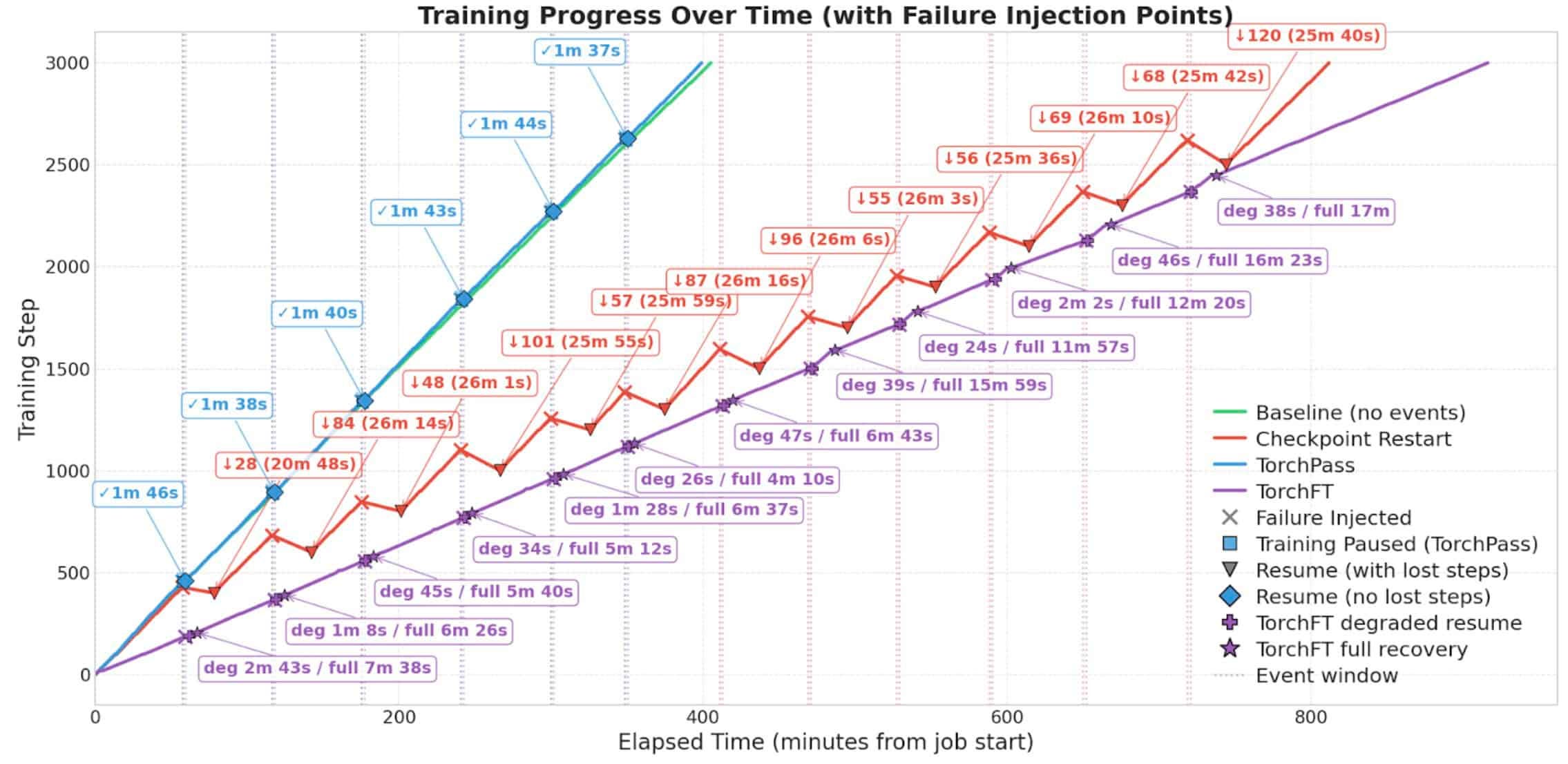 By direct comparison to the previous two frameworks, torchpass is the only licensed software product, and the only option that maintains the same training performance as jobs without fault tolerance. In other words, the code changes are minimal, there is no performance overhead. The cost comes in the form of idle nodes in the cluster or time spent pre-empting lower priority jobs.