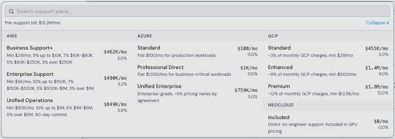 5. Support [% uplift]: The cost of support. For example, on AWS, this is an extra charge on the entire cloud bill, with three different options that range anywhere from an initial 10% to a final 3% of the bill as the monthly spend graduates to higher tiers. Of course, different tiers of support mean better response in the event of an outage or performance issue.