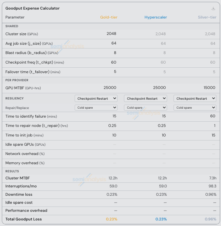 Specifically, we assume that the average job size is 8 GPUs of the total 512 (1.5% of the cluster). Notably, in scenarios with WideEP, Disaggregated Prefill/Decode, and fault-tolerant training, this job size (and resulting blast radius) would be much larger. As discussed in Scenario 1 and 2, we provide example inputs for the goodput calculator based on our hands-on testing experience and customer interviews. Specifically, we assume an equal GPU-level MTBF for Gold-tier and hyperscaler of around 25,000 GPU-hr, while the example silver-tier provider is assumed to have a GPU-level MTBF of 15,000 GPU-hr. We assume that both Gold-tier and hyperscaler identify failures in 15 minutes, while the silver tier provider takes 1 hour. We also assume that on Gold-tier and hyperscaler the time to replace the failed node is 15 minutes, however in this case we assume 8 hours for the silver-tier neoclouds, illustrating why certain workloads can tolerate this downtime even when the provider has no hot spares available, and accommodates an entire repair/replace workflow on the physical hardware.