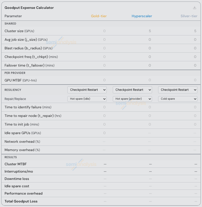 6. Goodput Expense [% uplift]: The first item that is not showing up on a monthly bill and is an implicit cost associated with using lower-tier providers. We use this percentage to build in an additional cost of downtime on the cluster in the form of more rental time required, or less useful work being completed. In practice, the actual amount of downtime, or number of job interruptions depends on the provider, the individual datacenter, hardware, and workload. Inputs used to calculate this expense include the total number of interruptions/failures, time to identify the failure, and the time to repair/replace a node. The impact of a single failure/interruption also depends on the cluster design, e.g. the blast radius of the failures, training initialization time, average job size, checkpoint frequency and/or use of fault tolerant software frameworks. The inputs to this piece of the calculator is also an opportunity for users to price in the risk of a bad SLA from a risky provider, on a total % basis. For example, a 95% cluster uptime SLA commitment from the provider allows for 5% downtime with no response and not credits. Since this input is so complicated we have an entire second tab with multiple scenarios covered. More on this later.