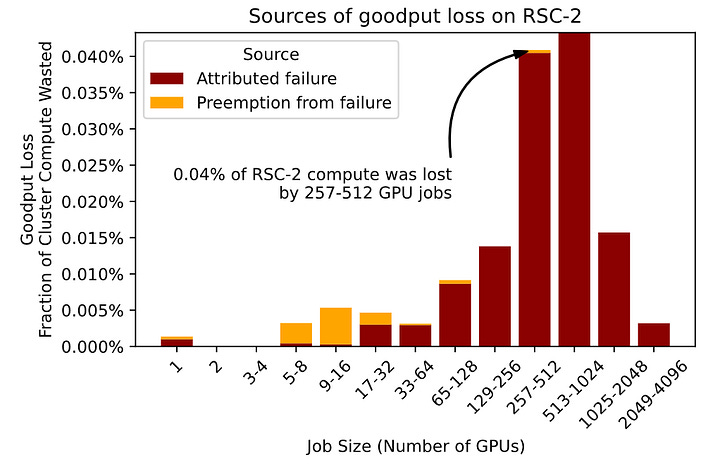 These issues are much more pronounced at scale. As we demonstrate below, larger jobs on larger clusters are much more impacted by individual failures or interruptions. If 80% of your cluster is running one job, and that job has to restart (a process that can take 10-15 minutes depending on storage, networking, CPUs, caching setup, etc.) this is costing you all of those 10-15 minutes of cluster time for job initialization time, plus all the wasted compute you did from the last checkpoint to the time of the failure/interruption/crash.