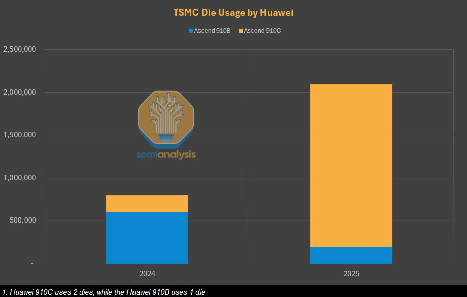 While SMIC, the largest foundry in China, does have 7nm, the vast majority of Ascend 910B and 910C are made with TSMC’s 7nm. In fact, the US Government, TechInsights, and others have acquired Ascend 910B and 910C and every single one used TSMC dies. Huawei was able to circumvent the sanctions on them against TSMC by purchasing ~$500 million of 7nm wafers through another company, Sophgo.