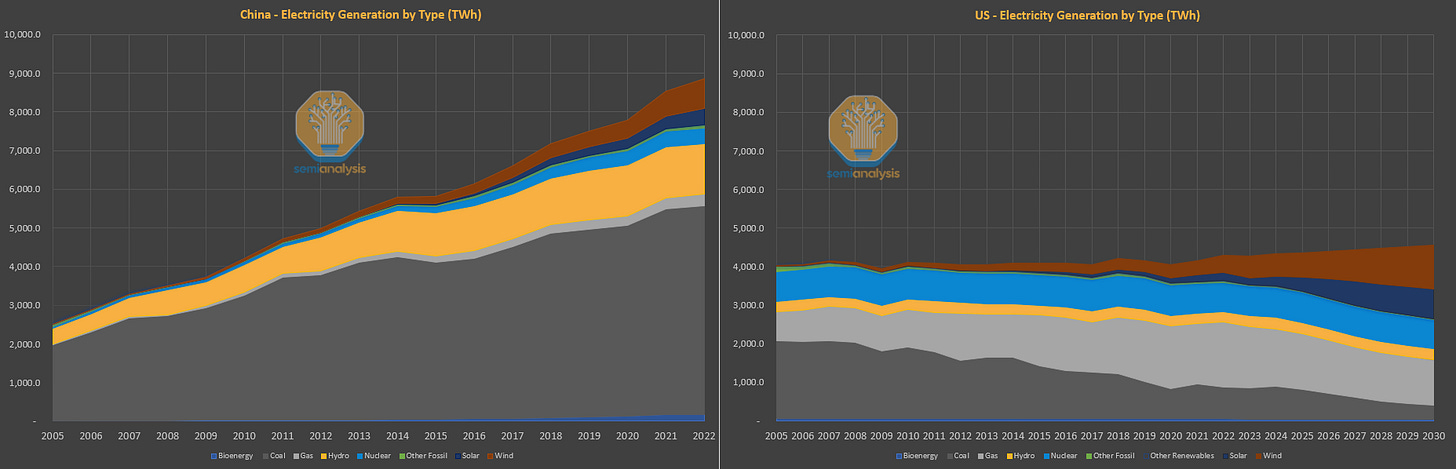 The common refrain in the West is that AI is power-limited, but in China, this is the opposite. The West has spent the last decade shifting a primarily coal-based power infrastructure to greener natural gas and renewable power generation paired with more efficient energy usage on a per capita basis. This is the opposite in China, where rising lifestyles and continued heavy investment mean massive power generation demand.