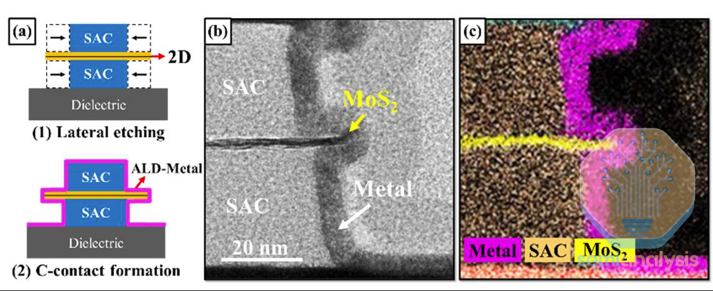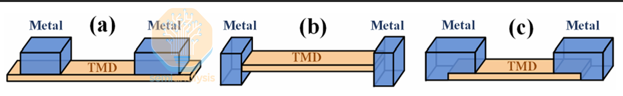 At that point, even the geometry of the contact stops being a secondary detail because it governs whether a “good contact” concept can be built repeatedly at scale. The optimal contact geometry remains under debate, and purely top-contacted or purely edge-contacted configurations can be difficult to realize robustly in production. Some work proposes C-contact, hybrid, or combined topologies as a manufacturable path, with first-principles calculations suggesting enhanced performance for C-contact-like configurations (including non-van-der-Waals sandwich contacts). The direction of travel is clear: the industry is converging on manufacturability-driven compromises where the theoretical ideal matters less than the geometry that survives process variation and still delivers acceptable Rc.