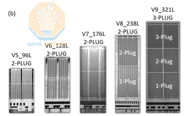The major change from the 238-layer V8 generation to Hynix 321 layer V9 is an additional deck and plug. A deck is a stack of horizontal layers, alternating conductive and insulating layers, that is processed all at once. The layers are deposited, patterning and partial etch of the contacts is done (a contact is needed at each conductive layer to access the transistors gated by that layer – this is the wordline of the memory), and the channel holes are etched and filled with polysilicon and the charge trap layer surrounding it. The “plug” term you see in the images denotes this completed, filled channel that plugs the hole.
