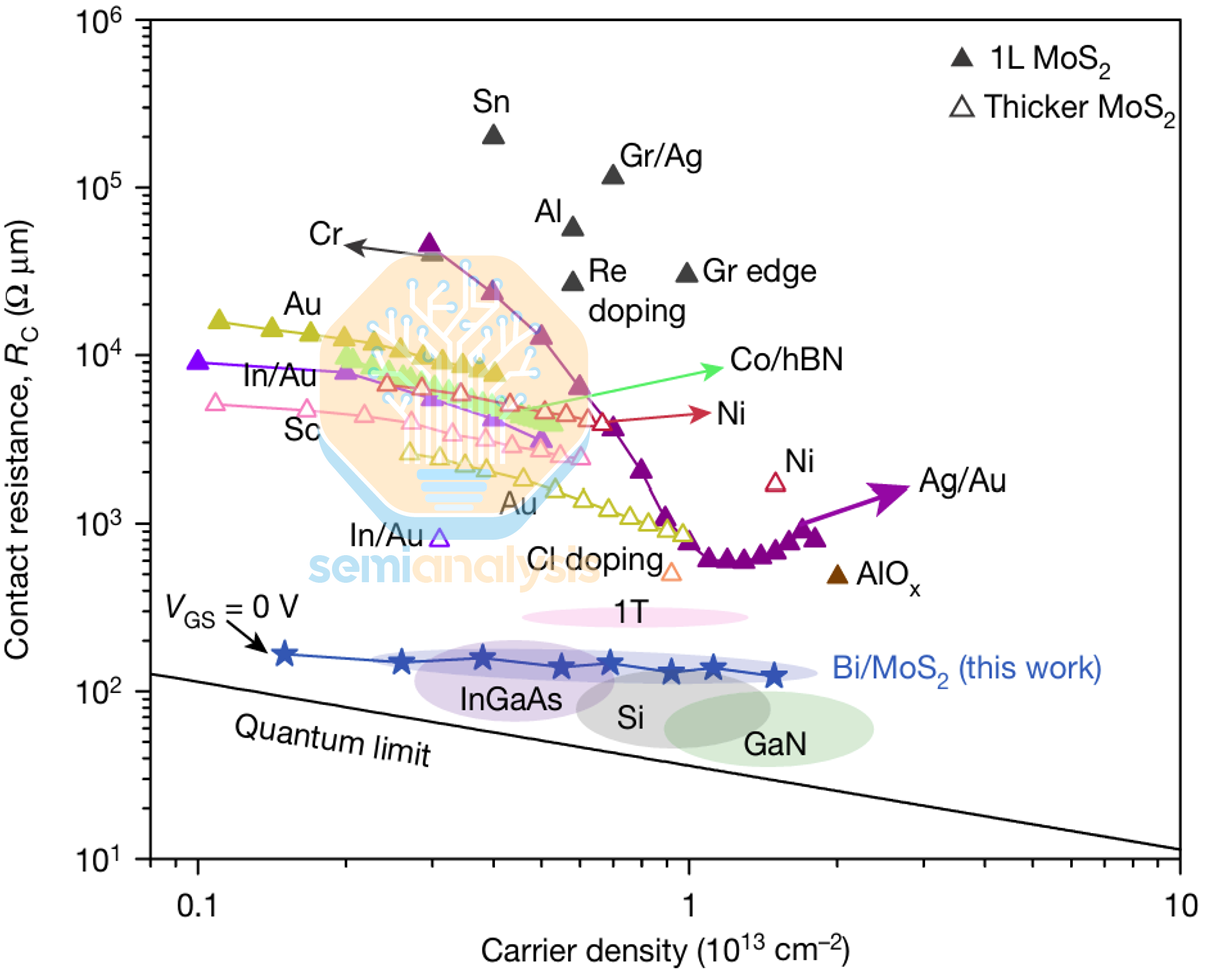Once you accept that the near-term battle is integration, the next battle is even more unforgiving: contacts. Performance must improve to meet industrial requirements, and contact resistance has always been the focal point because it determines whether the device is contact-limited. Plenty of prior work reports low n-type contact resistance for MoS₂ under specific contact schemes, but the fine print is that these results are often demonstrated at high VGS and VDS, which is not the bias regime that matters for products. The relevant target regime is low voltage operation, with |VGS| < 1 V, |VDS| < 0.1 V, and contact resistance Rc < 100 Ω·µm. That reframes the goal: you need high carrier concentration at low bias so Rc can move toward the quantum limit under realistic operating conditions, not just under overdrive.