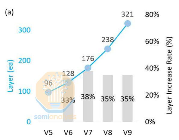 When the number of layers per deck can’t be increased, the number of decks must be increased instead. This adds a lot of processing steps. From V8 to V9, Hynix says there are 30% more process steps overall and 20% more etch steps. Don’t get too excited, WFE bulls, the layer increase was close to 35%, so layer count is increasing faster than processing steps.
