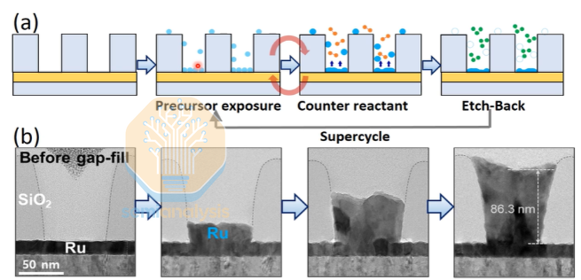 Through precisely engineered “super-cycle” steps, ozone etch-back is utilized to remove unnecessary nuclei from the sidewalls, achieving perfect bottom-up filling. More importantly, the deposited Ruthenium undergoes recrystallization after heat treatment, merging into a near-single-crystal structure. This aligns the vertical current flow perfectly parallel to the low-resistance c-axis, thereby maximizing the device’s conductive performance.