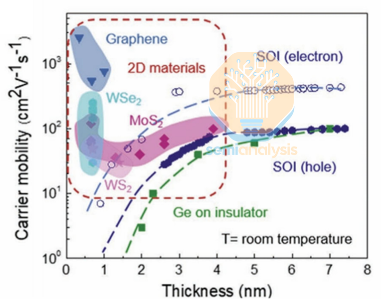 2D transition metal dichalcogenides (TMDs) keep resurfacing in logic discussions for the same reason silicon keeps getting punished as gate lengths push into the sub-10 nm regime. Once channels and electrostatics are forced into ultra-thin geometries, off-state leakage stops being a design nuisance and starts becoming a physics wall, driven by direct source-to-drain tunneling. TMDs remain one of the few plausible levers to keep leakage under control because the combination of a larger bandgap and higher effective mass suppresses tunneling. That matters precisely where conventional silicon FETs begin to leak badly at very short gate lengths.