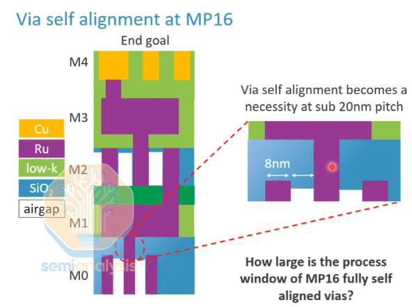 At a 16 nm pitch, the via critical dimension (CD) is approximately 8 nm, with an 8 nm spacing as well. Such extremely small dimensions introduce significant challenges: