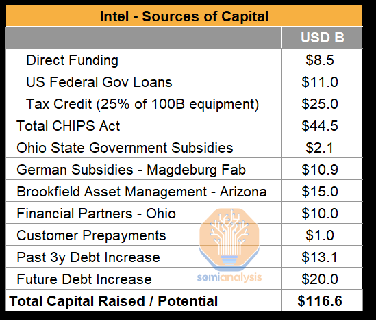 This is even after Intel pulled out accounting tricks like extending equipment depreciation periods for equipment to 8 years from 5. Add on the additional ~$20bn of annual capital expenditure to ramp up all the new nodes and fabs and FCF has been negative over the previous 2 years. To plug the financing hole Intel has had to rely on a wide variety of capital sources to fund everything: traditional debt financing, government support, and even more creative financial engineering schemes like the Brookfield fab deal to find a way to pay for everything.