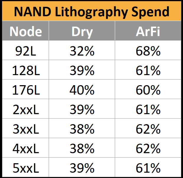 The secular trend in NAND is that lithography spend will continue to scale slower than the rest of the process cost. ASML projects >10% growth in lithography cost per node. Outside of separating CMOS and cell wafers and increases in deck count, there doesn’t seem to be much driving lithography intensity up. In the latter half of the decade, lithography tools may fall under 10% of the total cost of a NAND fab from a WFE perspective.