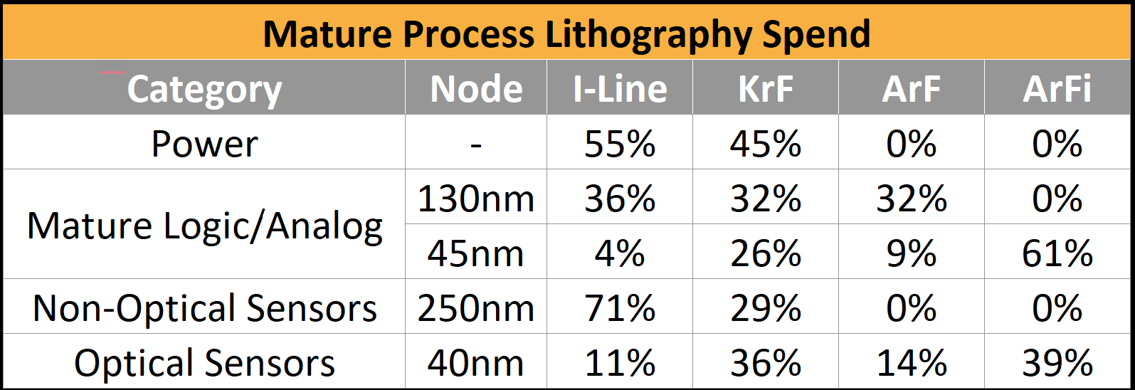 With mature process technologies, there is tremendous wafer growth, but some of it is in areas where Nikon, Canon, SMEE, EVG, and others are competing. SMEE, China’s lithography champion, is a dark horse that could take a significant share in I-Line and KrF. SMEE’s ArF and ArFi tools still do not work, but that could change over the next handful of years. Despite Nikon's rapid improvement in recent years, we still assume ASML controls most of the ArF and ArFi markets.