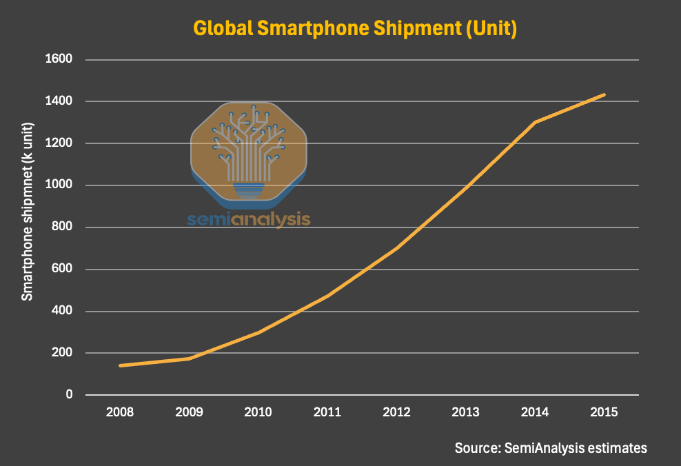On top of this, smartphone demand growth was a near-vertical volume step-up. Global smartphonec by broader Android price-tier penetration and iPhone scaling. On the cloud side, while the servers’ shipment growth increased much more slowly compared to mobile during that period, the key change was the DRAM content per server. The industry was shifting toward higher-memory configurations to support consolidation, virtualization density, and early big-data workloads. DRAM content per server increased from single-digit gigabytes (GBs) to tens of GBs, representing a significant step-function increase in memory intensity per system.