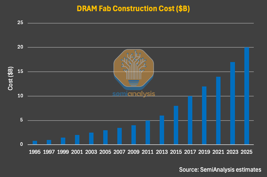 Memory manufacturing, much like logic, is among the most capital-intensive industries in the world. Building leading-edge DRAM and NAND fabs requires multi-billion-dollar investments (which have steadily increased over the past few decades), multi-year construction timelines, extended yield-learning curves across successive process nodes, and lengthy ramp-up periods before meaningful volume production is achieved.