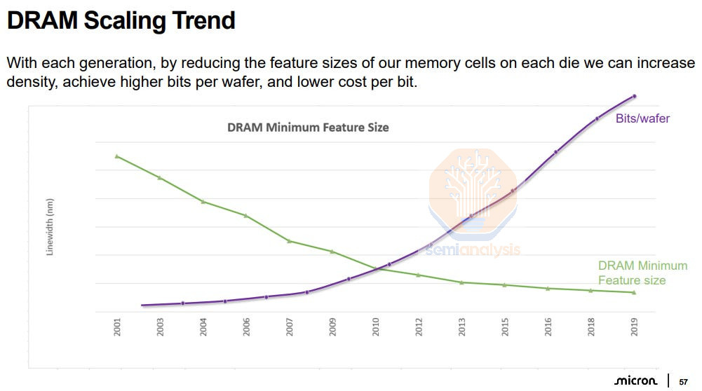 For much of the industry’s history, DRAM density scaled faster than logic, doubling roughly every 18 months instead of 24 months and driving dramatic cost reductions. As a commoditized product, manufacturers needed to sustain cost-per-bit declines to stay competitive. Suppliers who couldn’t compete on cost fell into a downward spiral: low sales left them short on cash to finance next-generation nodes, which in turn left them further behind on cost-per-bit. Many DRAM producers fell victim and went into bankruptcy, resulting in consolidation to just a few major players today.