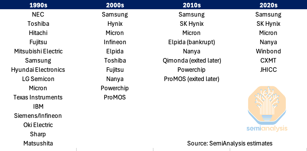 During the Windows PC supercycle of the early to mid-1990s, there were approximately 20 meaningful DRAM suppliers. Elevated demand and strong pricing attracted aggressive capital investment and new entrants. Subsequent downcycles systematically eliminated the weaker players. From roughly 20+ players in the mid-1990s, the number of players contracted to the mid-teens in the 2000s and early 2010s, to fewer than 10 relevant suppliers in the 2020s. Today, there are only 3-4 material suppliers.
