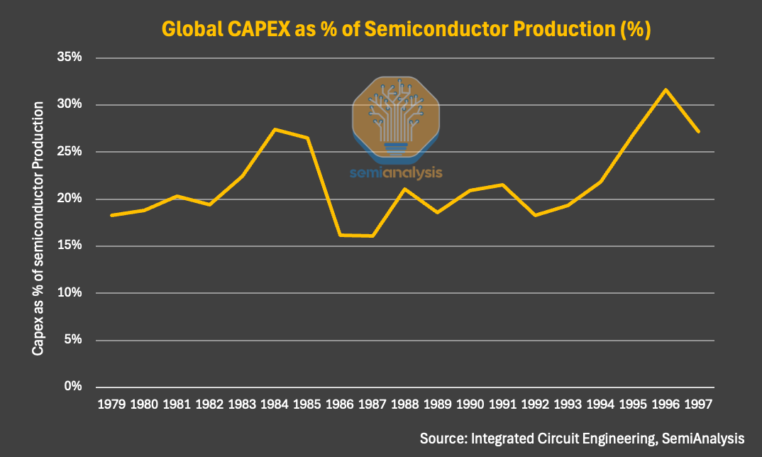 Unsurprisingly, this set the stage for a downturn. Japanese incumbents and then-emerging Korean players responded with aggressive capacity expansion—bringing new fabs online and accelerating process shrinks. This was reflected in global semiconductor manufacturing spend as the supercycle took hold, with capex as a percentage of semiconductor production rising steadily and at one point exceeding 30%. Reinforcing this late-cycle signal, roughly 50 fab construction plans were announced during 1995–1996 alone.