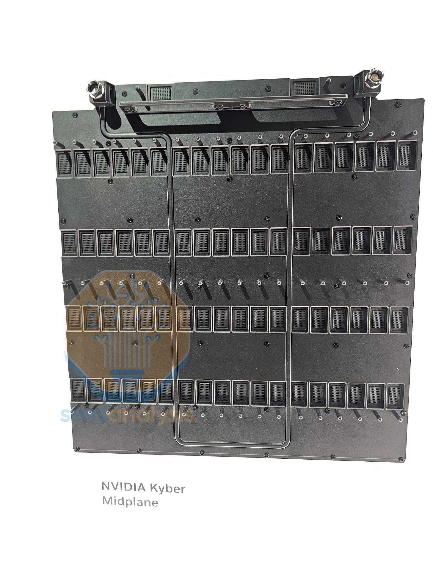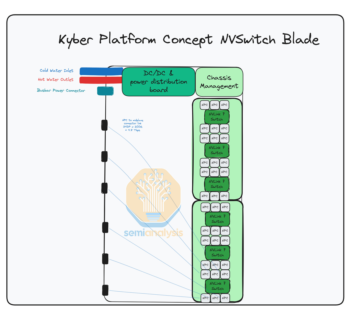 Each NVLink Switch Chip connects via flyover cables to the connector (144 DPs used x 200 Gbit/s bi-di channel = 28.8Tbit/s) connectors at the edge of the switch blade, and these connectors plug into the midplane board. Nvidia is looking into using co-packaged Copper to reduce loss further, in case NPC doesn’t work. As far as we know the Nvidia is telling supply chain to go for fully co-packaged copper.