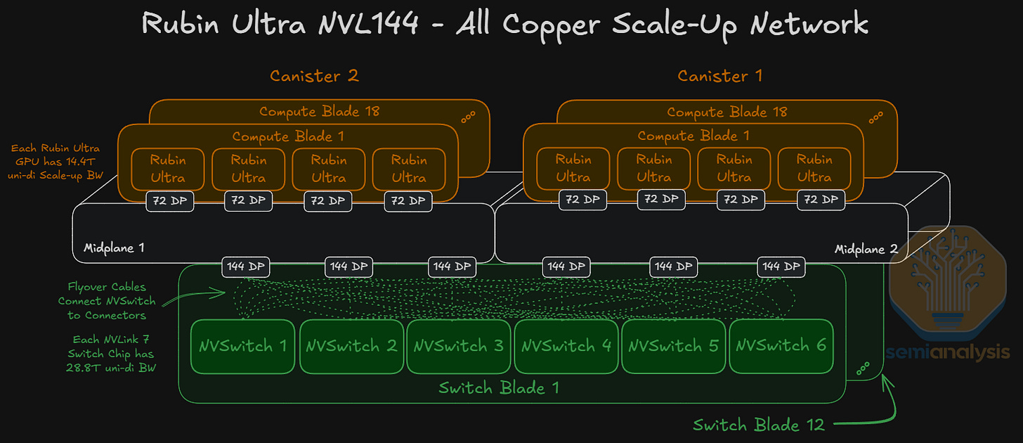Moving back to the Kyber Rack, each Rubin Ultra logical GPU offers 14.4Tbit/s uni-di of scale-up bandwidth, using an 80DP connector (72 DPs used x 200Gbit/s bi-di channel = 14.4Tbit/s) per GPU for connectivity to the midplane board. Connecting all 144 GPUs in an all-to-all network will require 72 NVLink 7.0 Switch Chips running at 28.8Tbit/s uni-di of aggregate bandwidth each.