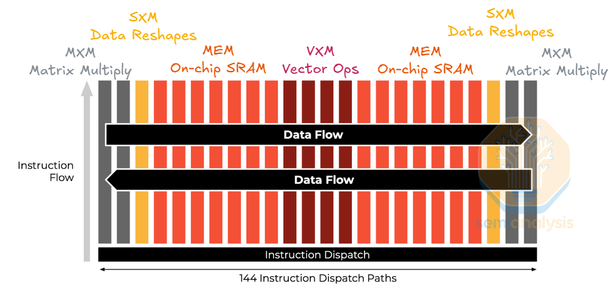 Concretely, LPU architecture has VXM slices for vector operations, MEM slices for loading/storing data, SXM slices for tensor shape manipulation, and MXM slices for performing matrix multiplication. Spatially, the slices are laid out horizontally, allowing the data to stream horizontally. Within a slice, instructions are pumped vertically across units. Conceptually, LPU resembles a systolic array that pumps instructions vertically and data horizontally.