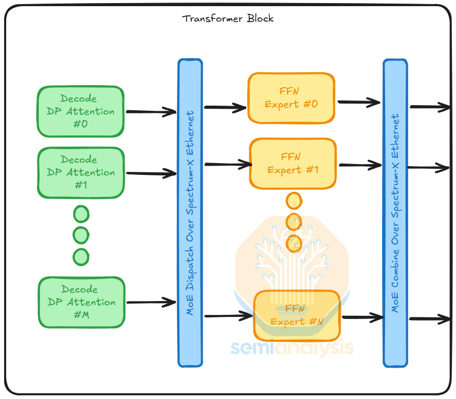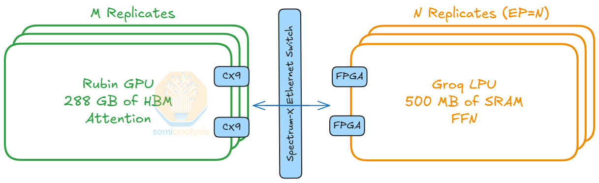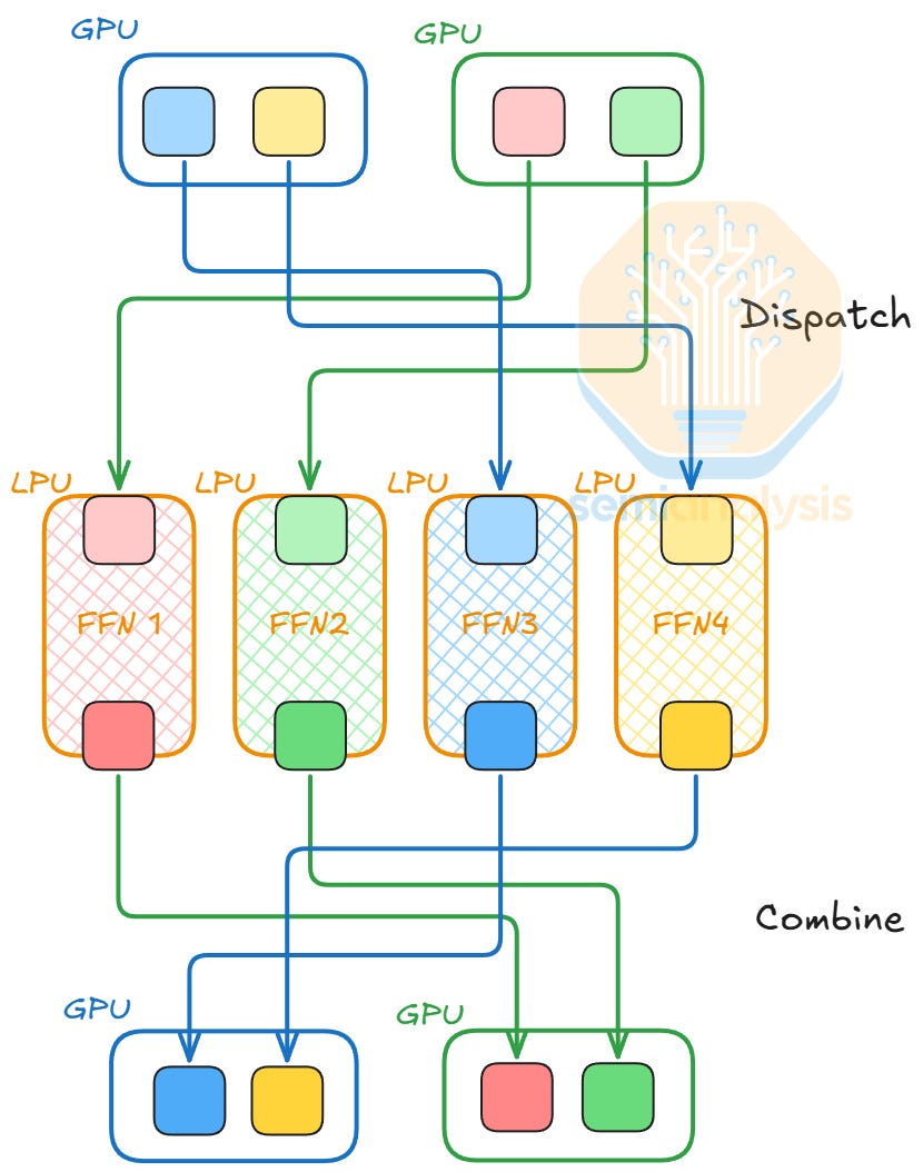 For LPUs, deploying a draft model or MTP layers is quite different from applying AFD. FFNs are stateless, while draft models and MTP layers require dynamic KV cache loading. Each FFN is around hundreds of megabytes, whereas draft models and MTP layers take up tens of gigabytes. To support this memory usage, LPUs can access up to 256 GB of DDR5 per Fabric Expansion Logic FPGAs on the LPX compute tray.