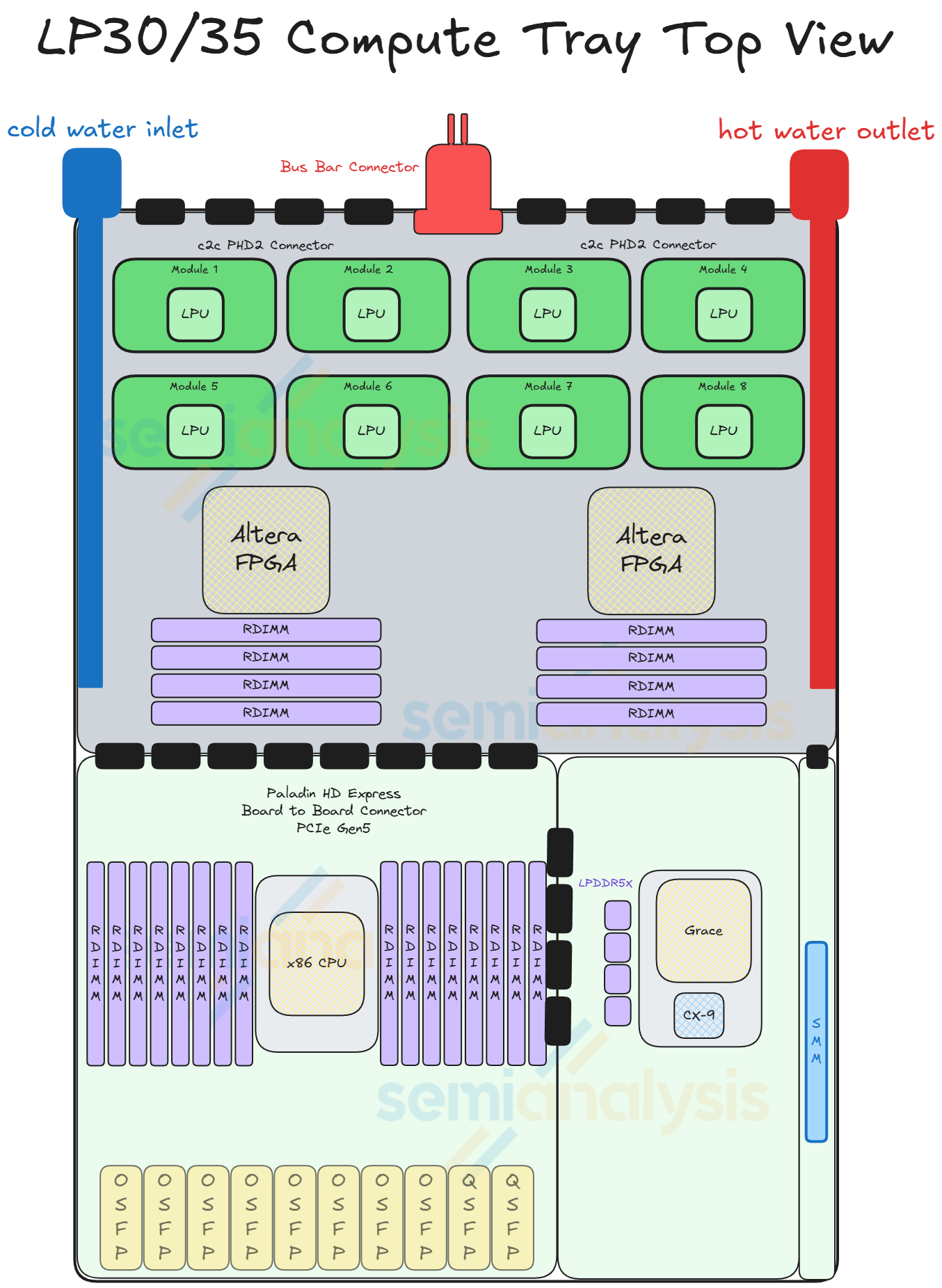 The LPU also has 1x100G going to one FPGA, with each FPGA interfacing with 8 LPUs. The 2 FPGAs each have 8x PCIe Gen 5 going to the CPUs. The LPU needs to traverse through the FPGA to interface with the CPU as LPUs don’t have PCIe PHYs to interface directly.