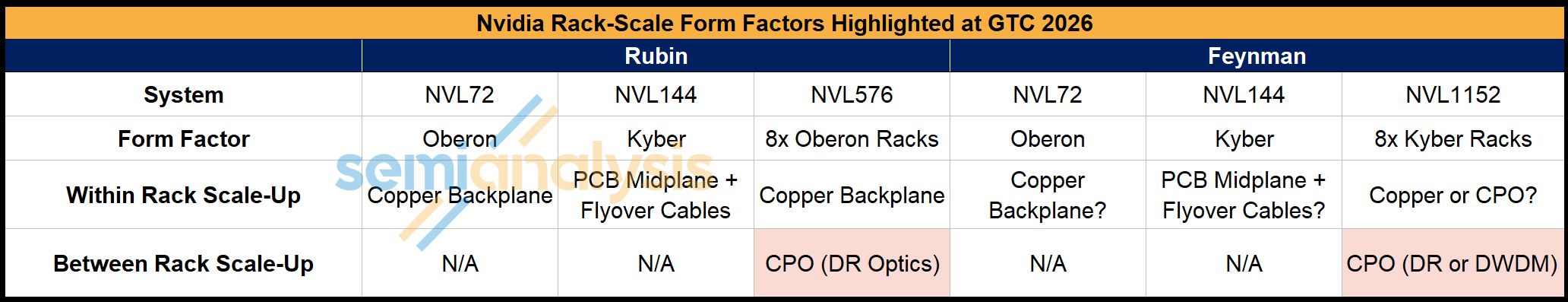 For Rubin Ultra NVL144 Kyber, there will be no CPO used for scale up as we have told clients multiple times, despite rumors from other analysts suggesting scale-up CPO introduction for Kyber. However, optics for NVLink are coming and will be progressively phased in. Scale-up CPO will first be used for the Rubin Ultra NVL 576 system to connect between 8 Oberon form factor racks, forming a two-layer all-to-all network. A copper backplane will still be used for scale-up networking within the racks however. This is still for low volume / testing purposes.