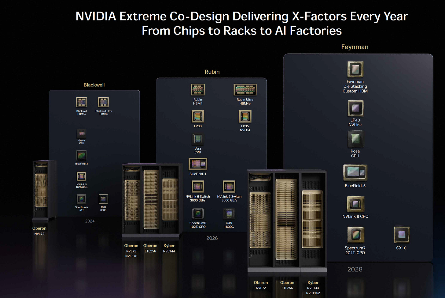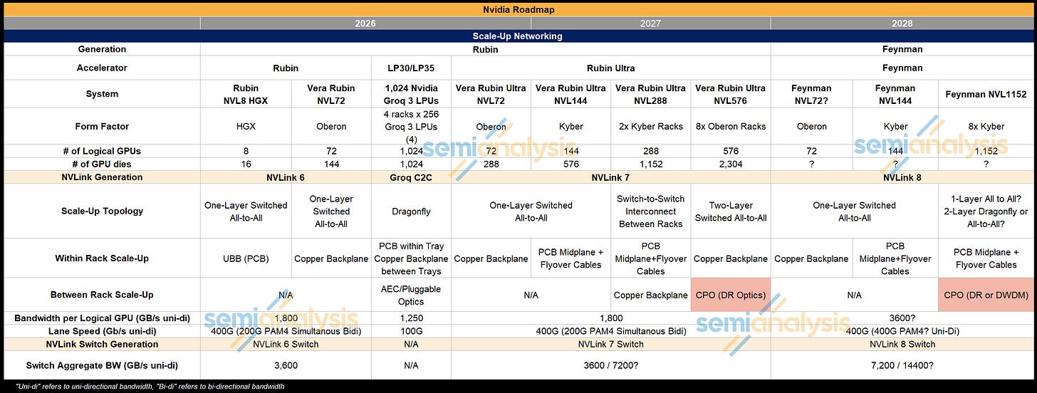 To push the scale up world size beyond 144 GPUs and across multiple racks, optics are needed as we are approaching the maximum compute density that is within the reach of copper. Rubin Ultra NVL576 is now on the roadmap with 8 racks of lower density Oberon.