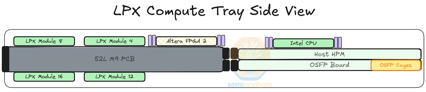 Each LPX compute tray or node has 16 LPUs with 2 Altera FPGAs, 1 Intel Granite Rapids host CPU and 1 BlueField-4 front-end module. As with other Nvidia systems, hyperscalers customers can and will use their own Front-end NIC of choice rather than paying for Nvidia’s BlueField.
