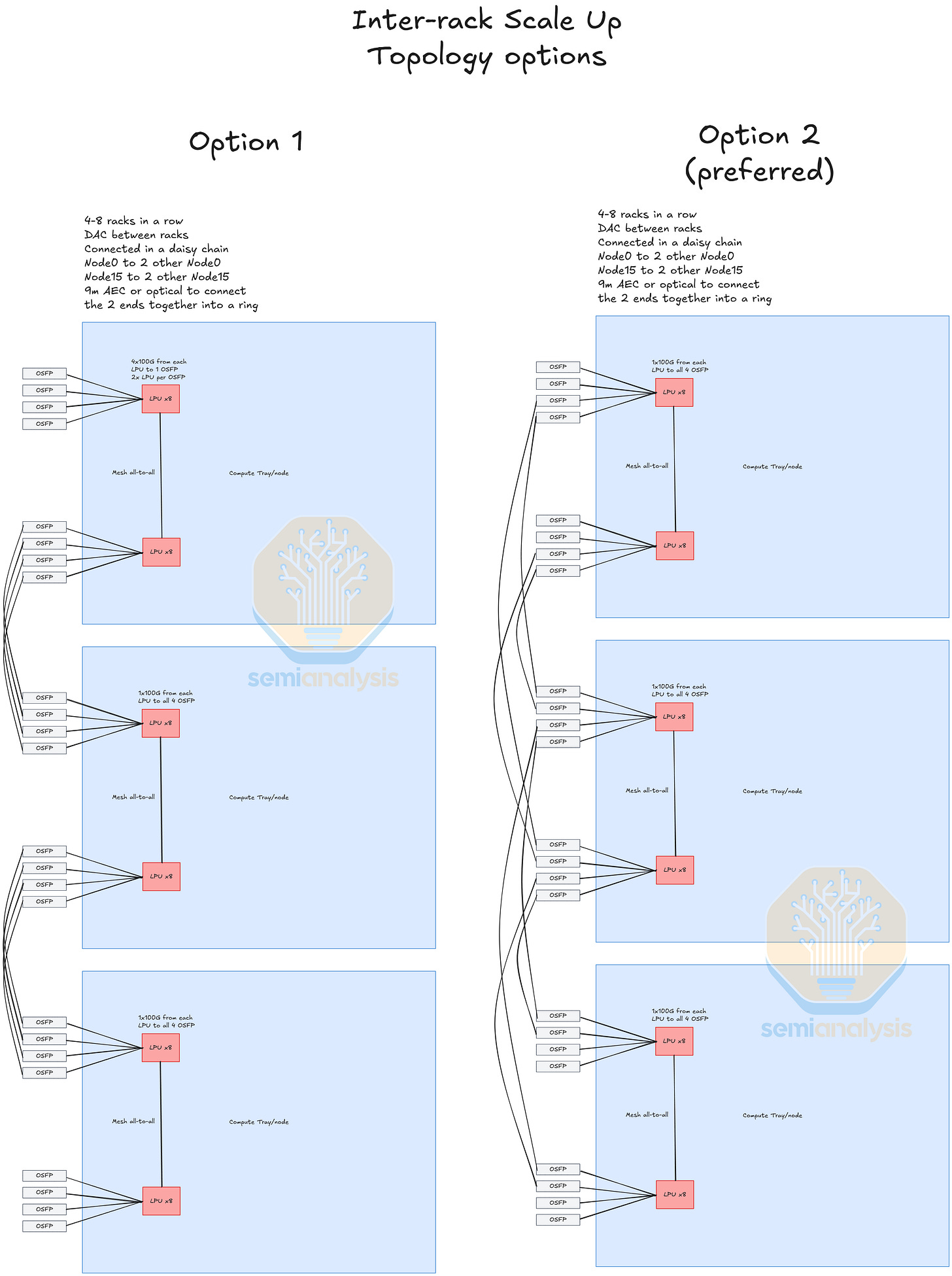 Lastly, there is the inter-rack C2C. Each LPU has 4x100G lanes that go to the OSFP cages to connect LPUs across 4 racks. There are various configurations that can be used for this inter-rack scale up. One option is 4x100G from each LPU going to one OSFP cage, each OSFP escaping 800G of C2C from 2 LPUs. However, for greater fan out the preferred configuration seems to be each 100G lane from the LPU going to 4 individual cages, with each cage escaping 800G of C2C from 8 LPUs. In terms of how the racks are networked together it appears to be a daisy chain configuration, with each Node0 connected to 2 other Node 0. This can all be achieved within the reach of 100G AECs, though optics can be used if necessary.