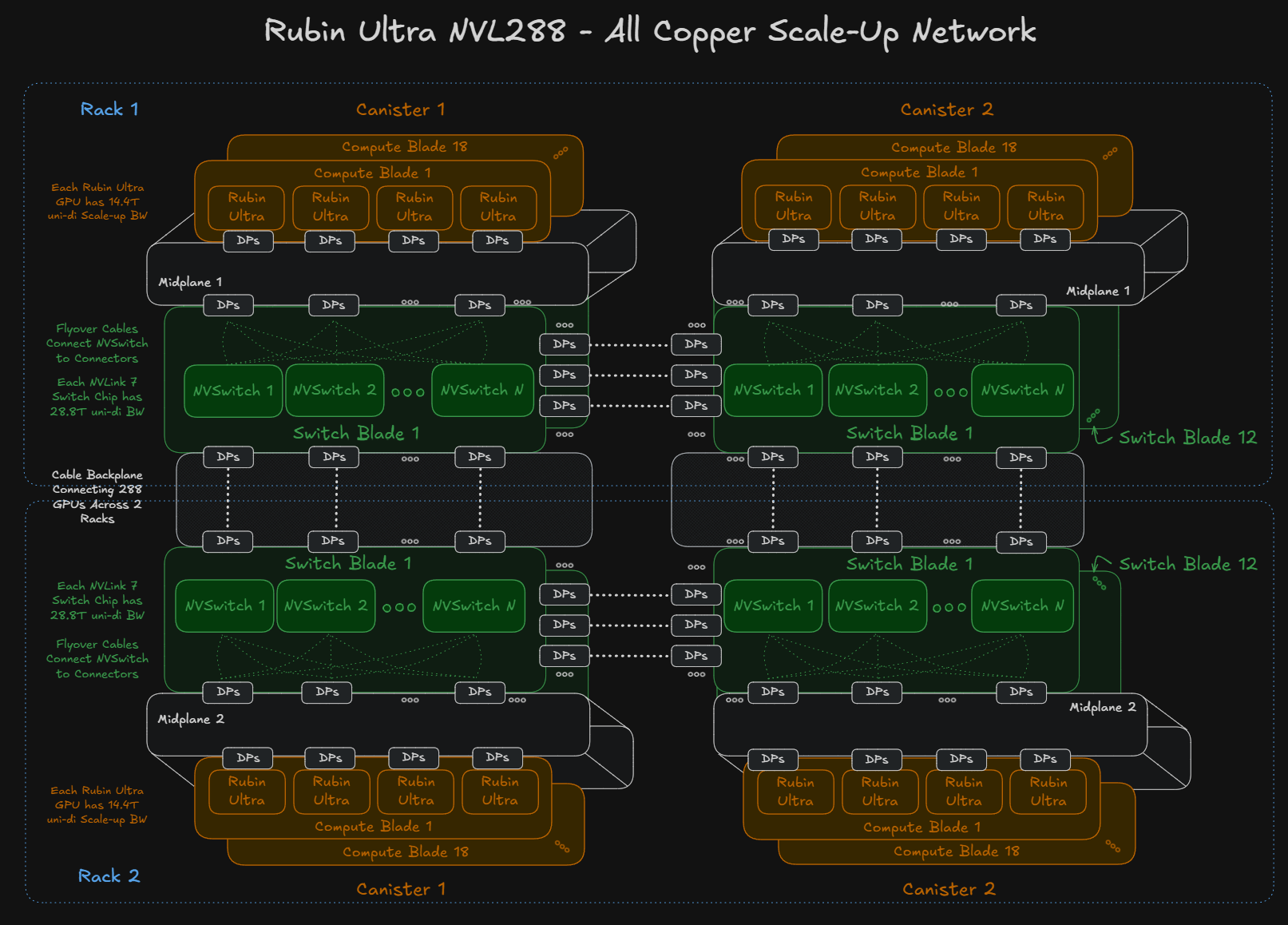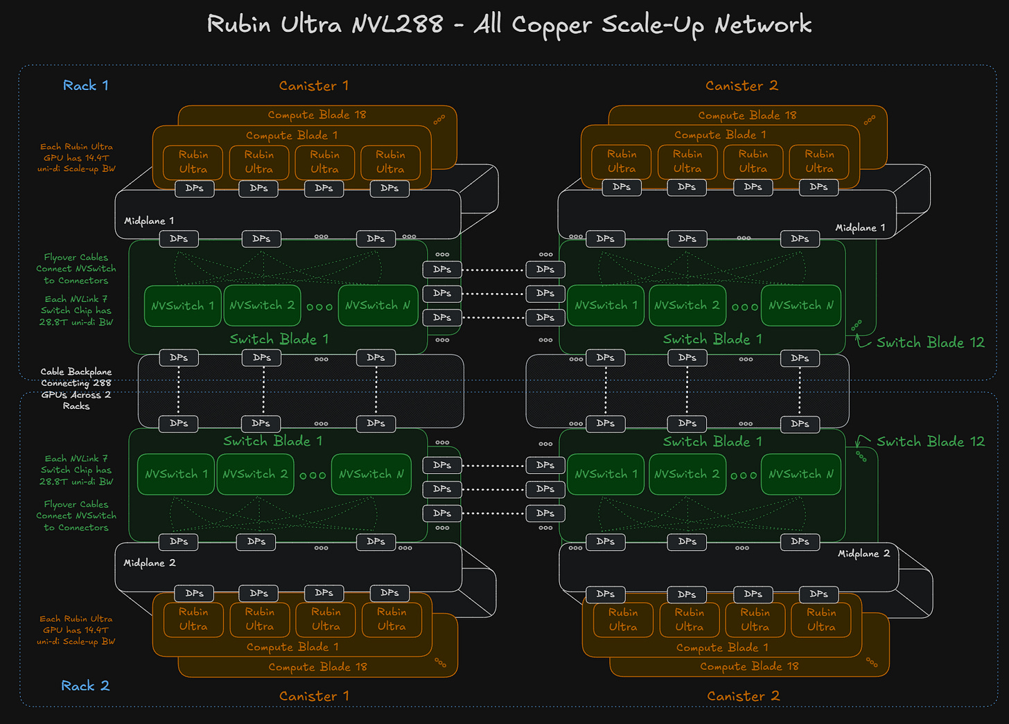 If Rubin Ultra NVL288 is deployed, each Rubin Ultra GPU will have a scale-up bandwidth of 14.4Tbit/s uni-di, requiring 144 DPs of cables to connect the NVLink 7 switches. 72 DPs per GPU times 288 GPUs means a total of 20,736 additional DPs required to connect this larger world size domain. This entails a lot of cables, so it is an upper bound of how much cable content could be used.