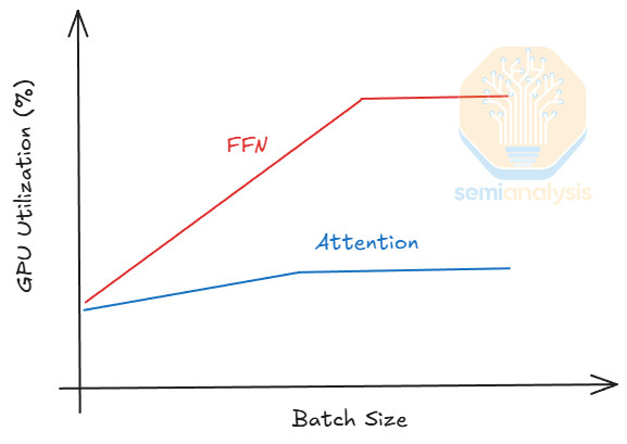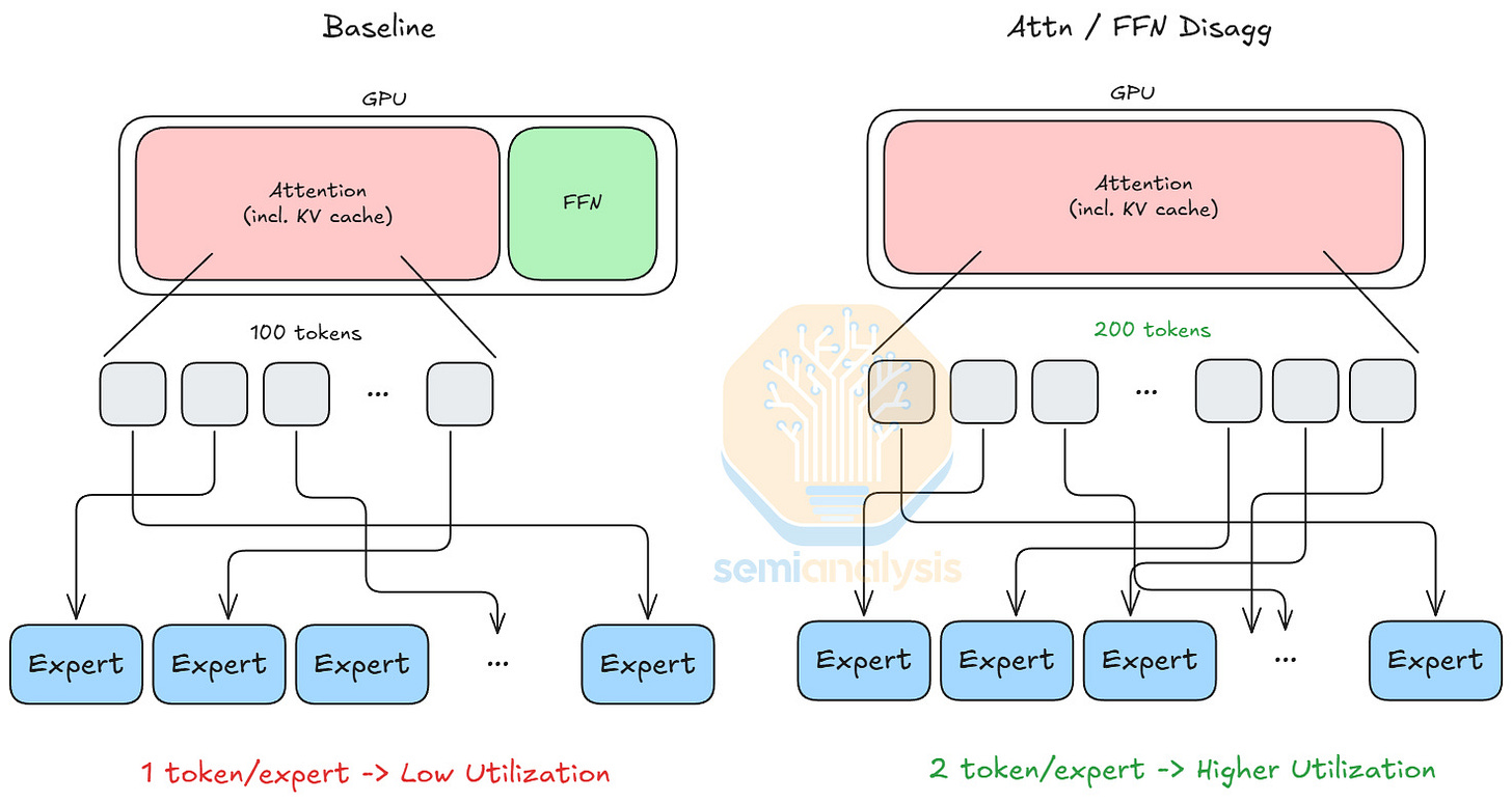 As state-of-the-art mixture-of-expert (MoE) models grow increasingly sparse, tokens can choose experts from a larger expert pool. As a result, each expert receives fewer tokens, leading to lower utilization. This motivates attention and FFN disaggregation. If a GPU only performs attention operations, its HBM capacity can be fully allocated to KV cache, increasing the total number of tokens it can process, which then increases the tokens each expert processes on average.