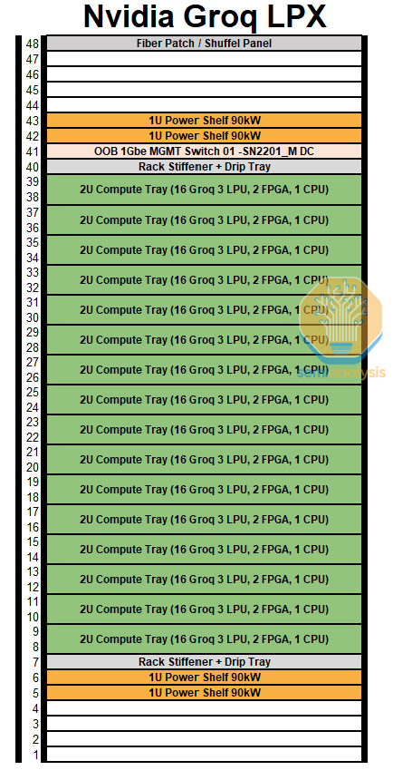 Let’s look at the LPX rack system, which has interesting details. Nvidia has displayed an LPX rack with 32 1U LPU compute trays with 2 Spectrum-X switches. This 32 tray 1U version that Nvidia has shown off at GTC is very close to Groq’s original server design before the acquisition. We believe that this server configuration is not the version that will be shipped in 3Q, with Nvidia implementing changes. Here, we will detail what we know about the actual production version. This was already detailed in the Accelerator model.
