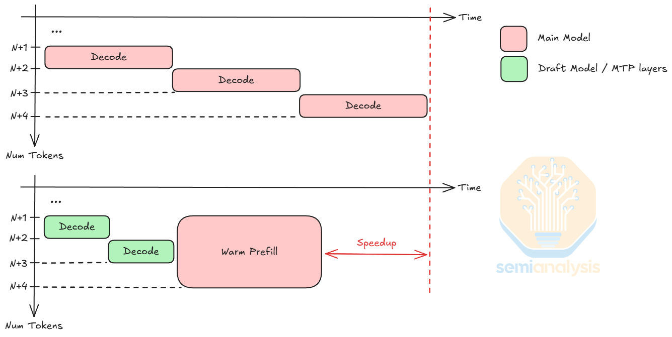 For a decoding step of context N tokens, adding k additional tokens during forward pass (a warm prefill of k new tokens) marginally increases the latency when k << N. Using this property, speculative decoding uses a small draft model or MTP layers to predict k new tokens, saving time since small models have lower latency per decode step. To verify the draft tokens, the main model only needs one warm prefill of k new tokens, at the latency cost of roughly a single decode step. Speculative decoding usually boosts output token per decode step by 1.5 to 2 tokens, depending on the draft model / MTP accuracy. With its low latency capabilities, LPUs can further increase the latency savings and improve throughput.