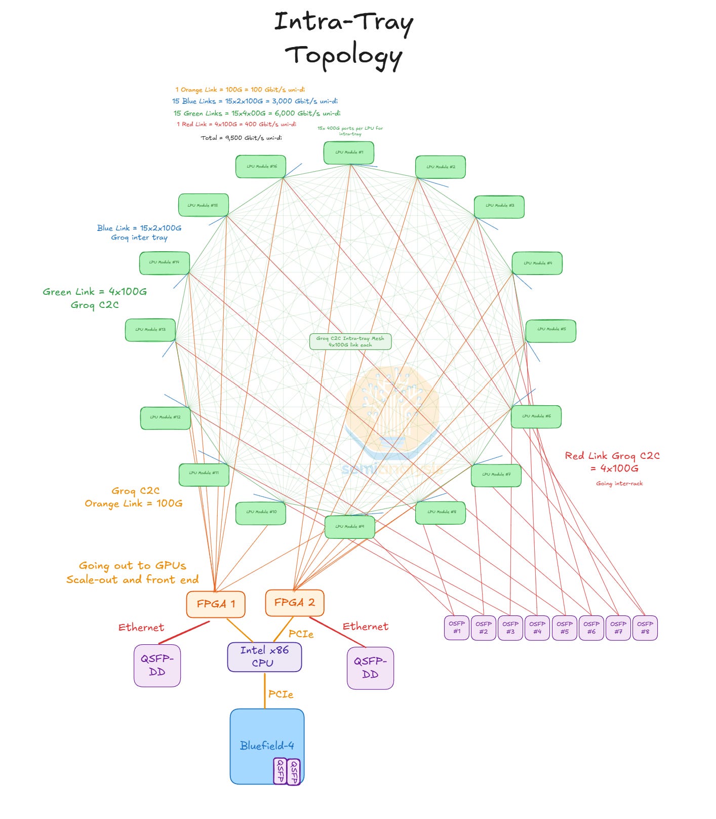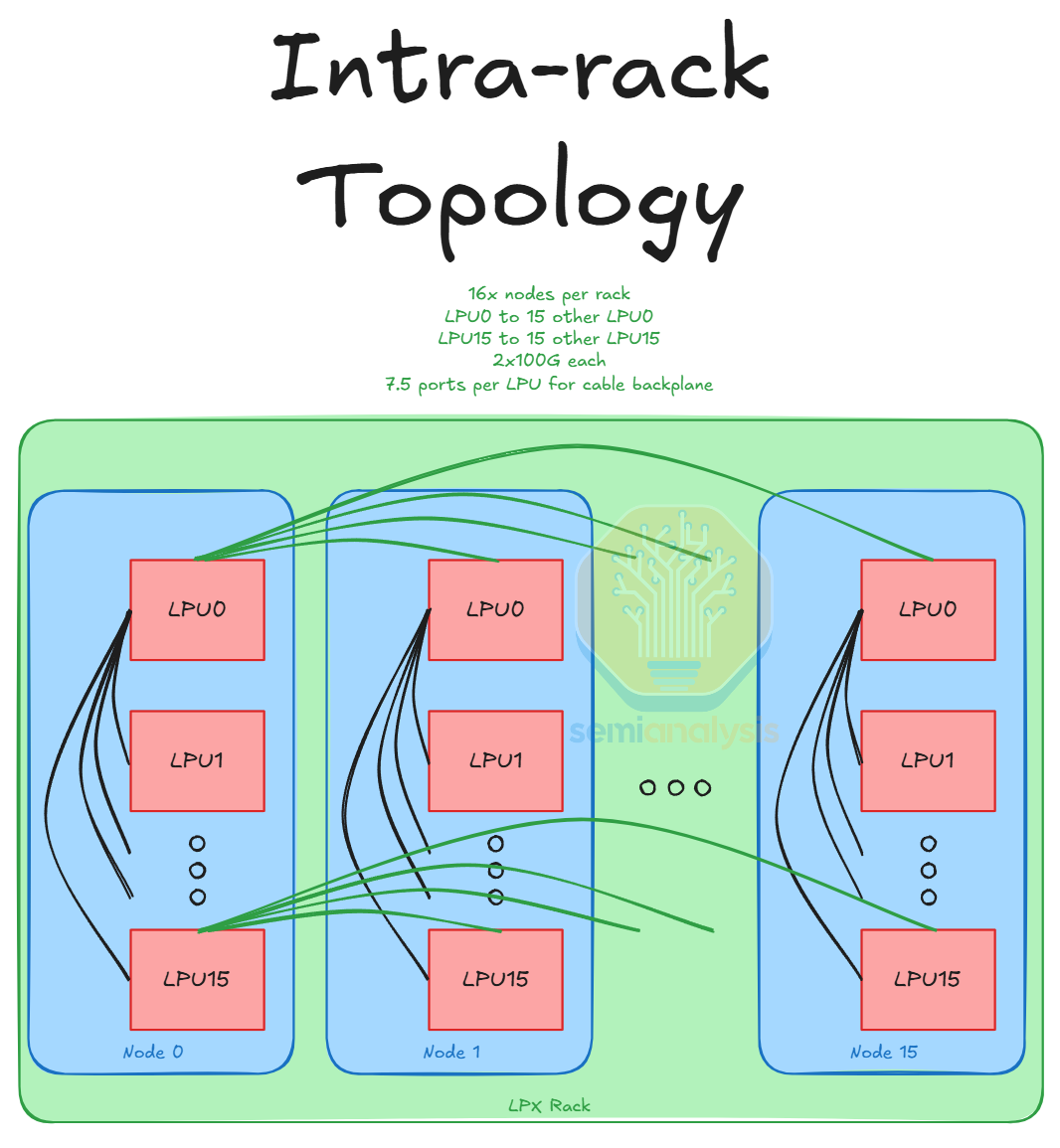 Each LPU connects to one LPU from each of the 15 other nodes in the server. Each of these inter-node links is 2x100G so there are 15x2x100G inter-node links coming out of each LPU. These inter-node links are via a copper cable backplane. In addition, each FPGA also connects to an FPGA in every other node at either 25G or 50G per link for 15x25G/50G. This also goes through the backplane. This means that each node has 16 x 15 x 2 lanes for inter-node C2C and 2 x 15 lanes for inter-node FPGA which is a total of 510 lanes or 1020 differential pairs (for Rx and Tx). Therefore, the backplane is 16 x 1020/2 = 8,160 differential pairs – we divide by 2 as each device Tx channel is a corresponding device’s Rx channel.