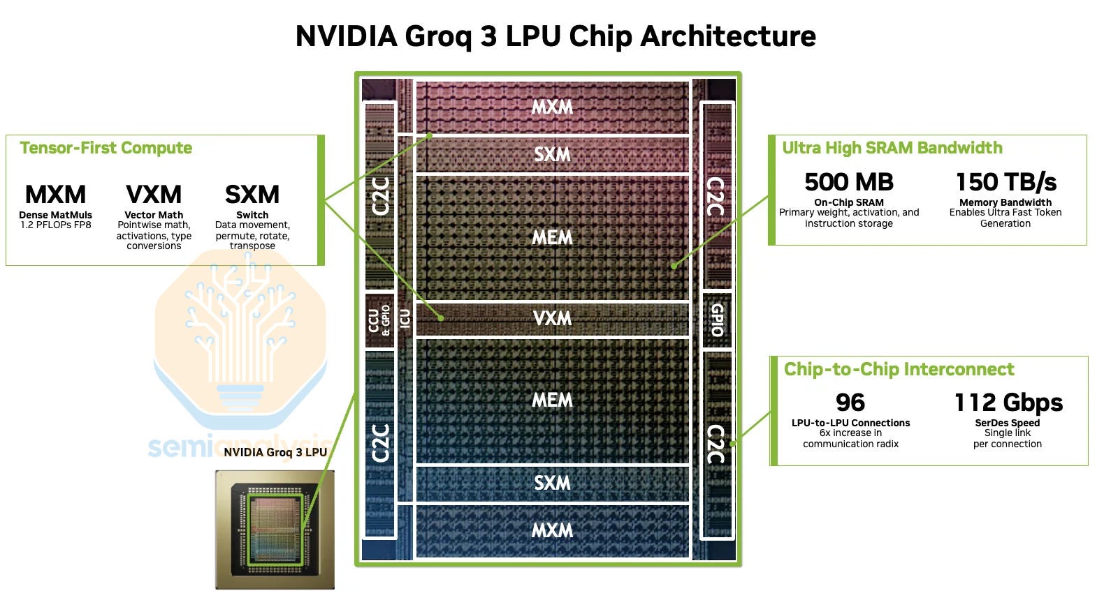This brings us to the Groq 3 LPU or LP30, with LPU gen 2 being skipped over. This chip has no Nvidia design involvement. The SerDes issues affecting v2 appear to be fixed. Behind the paywall, we will reveal the SerDes IP vendor which may come as a surprise. Nvidia also announced an LP35 which is a minor refresh of the LP30 which will remain on SF4 and will require a new tapeout. It will incorporate NVFP4 number format but given Nvidia is prioritizing time to market we don’t expect any other drastic design changes.