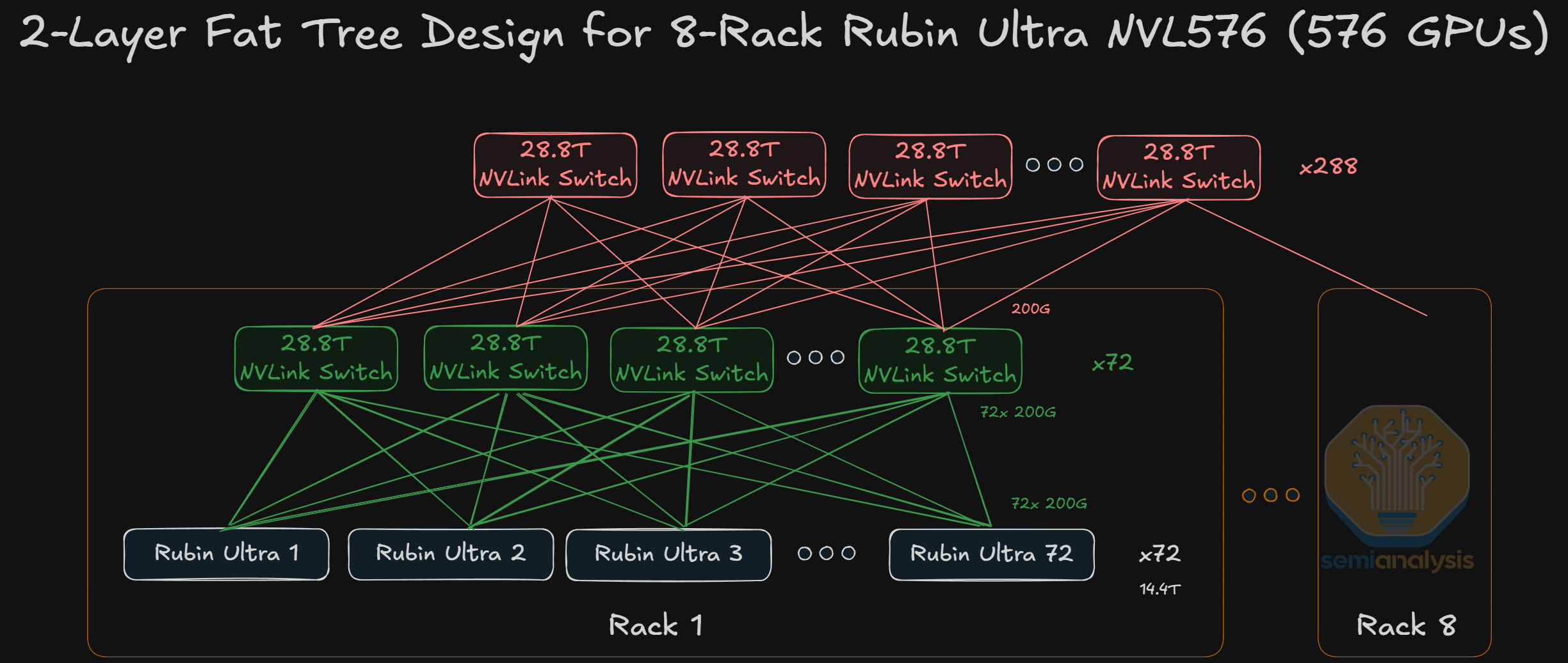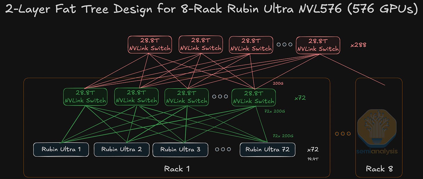 NVL576 – 8x Oberon Racks copper scale up within rack and CPO on switch between racks in a two tier all to all topology. This would be low volume for test purposes