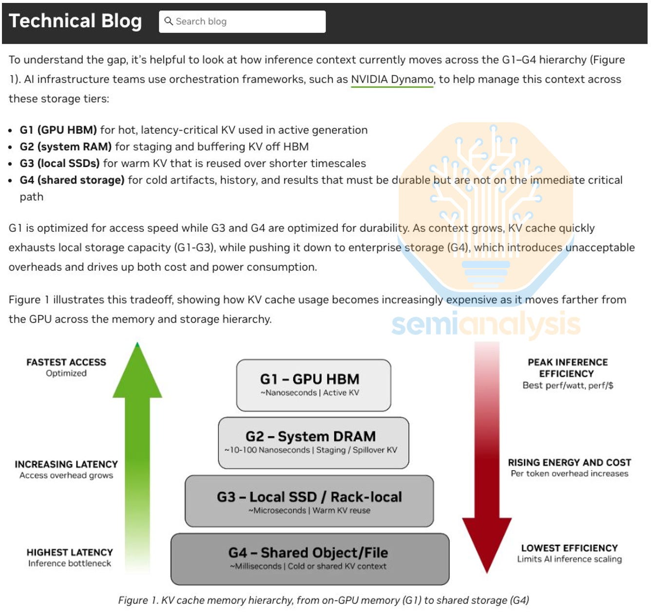 NVIDIA introduced a “new” intermediate storage “tier G3.5” within the inference memory hierarchy at CES in January. Tier G3.5 NVMe sits in between tier G3 DRAM and tier G4 shared storage (also NVMe, or SATA/SAS SSD, or HDD). Previously referred to as ICMS (Inference Context Memory Storage) and now branded as the CMX platform, this is just another re-brand of storage servers attached to compute servers via Bluefield NICs. The only difference from NVMe architectures is the swap from Connect-X NICs to Bluefield NICs.