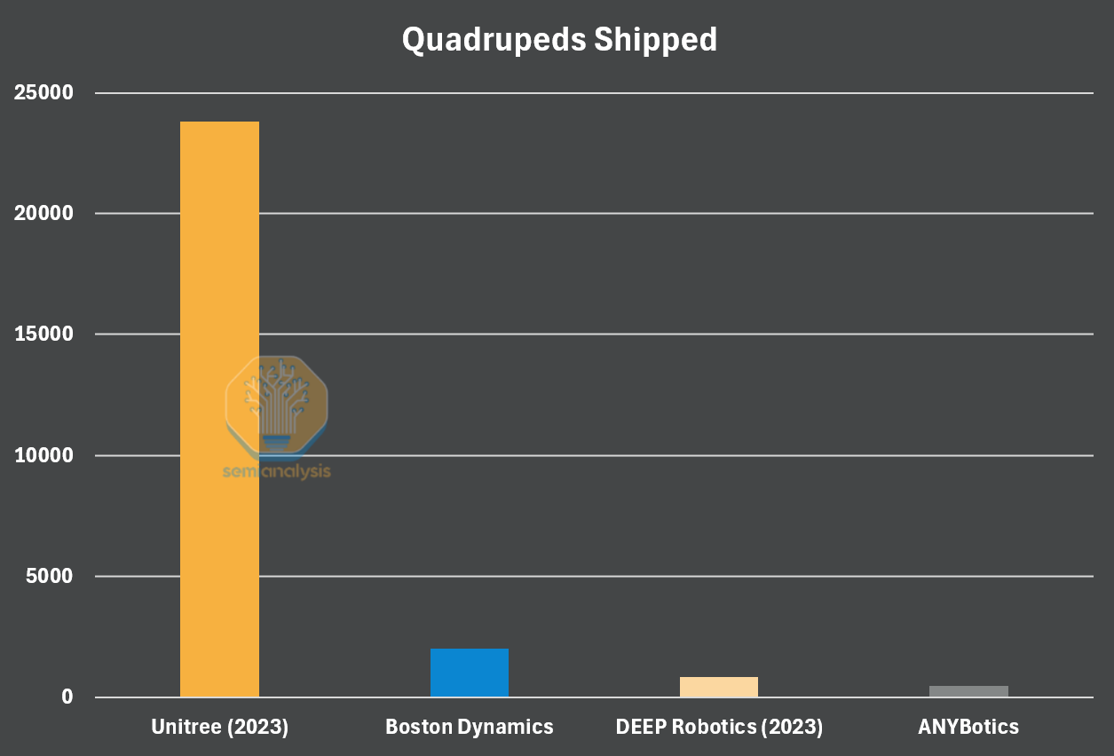 The quadruped market is early, but Unitree in 2023 alone is already ~10x the total shipments of the next competitor. The numbers are significantly higher now, but this is the last public statements.